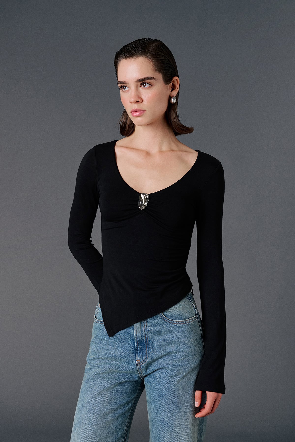 Asimetrik kesim, aksesuar detaylı, sol tarafı büzgülü, derin V yaka, uzun kollu, tam kalıp bluz.