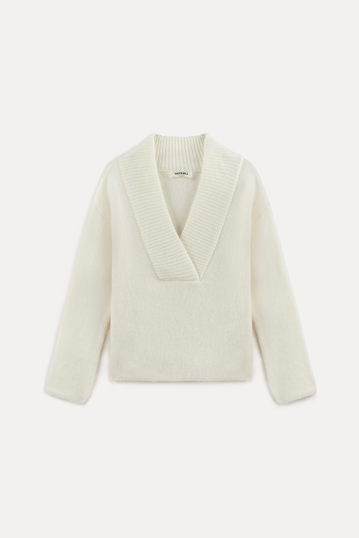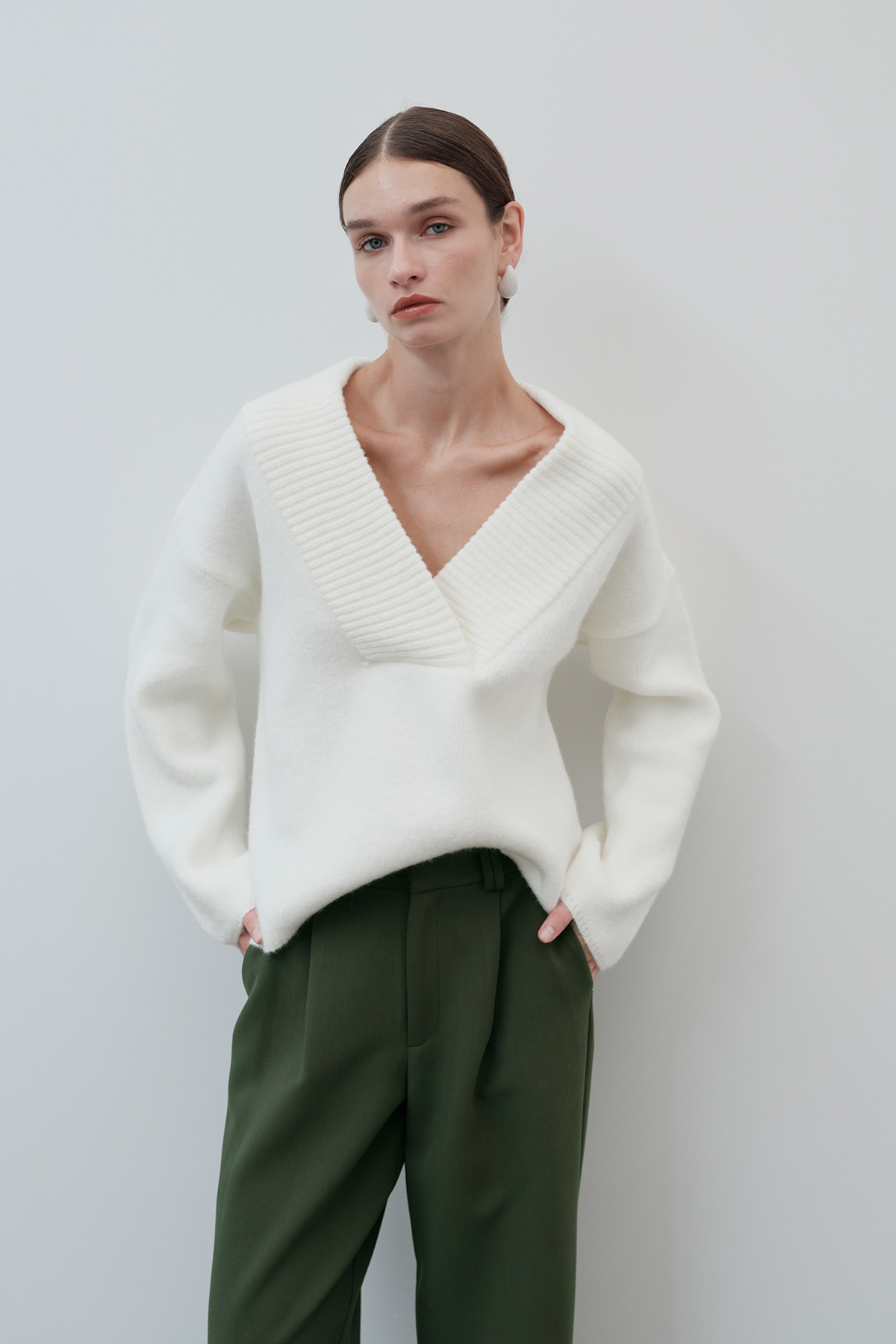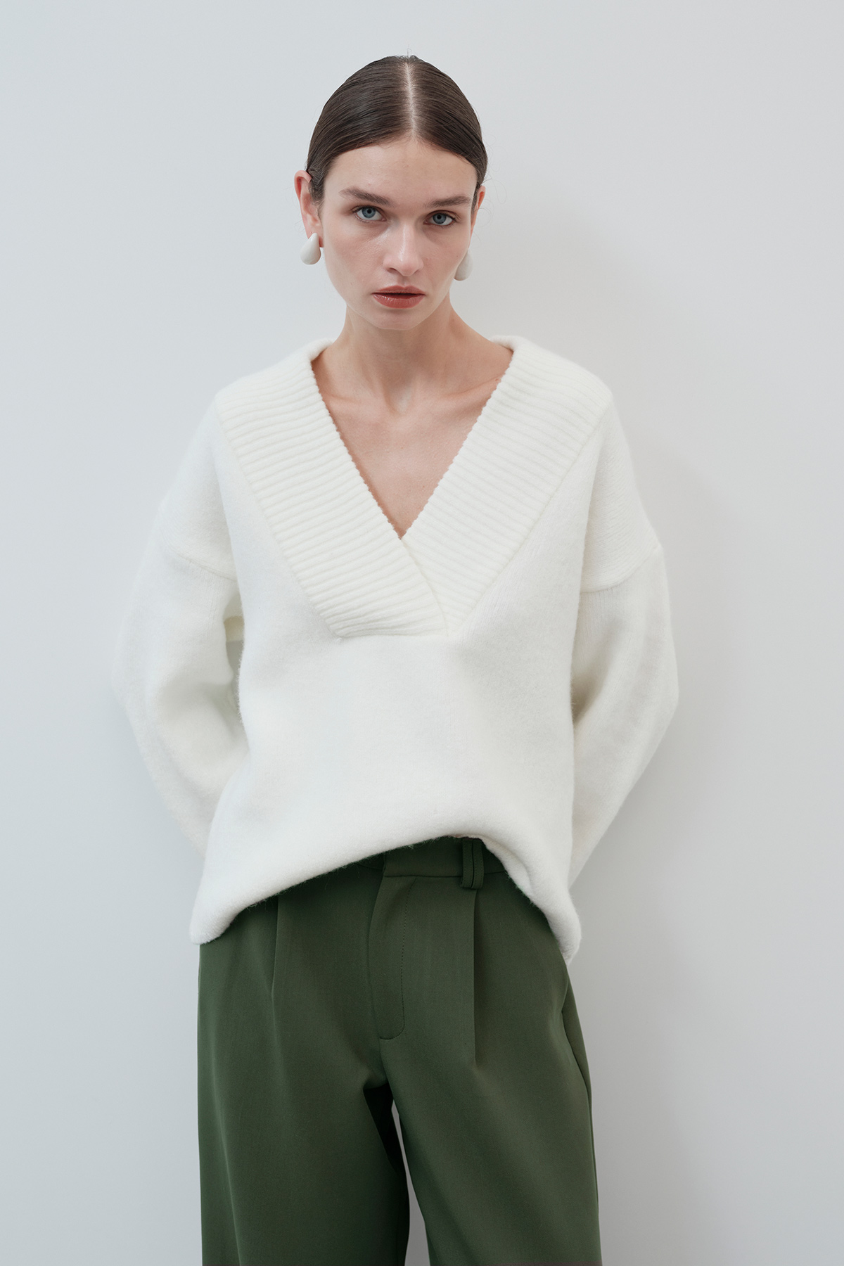 Derin v yaka, kalın örgü kumaşlı, yumuşak dokulu, kadın kazak
