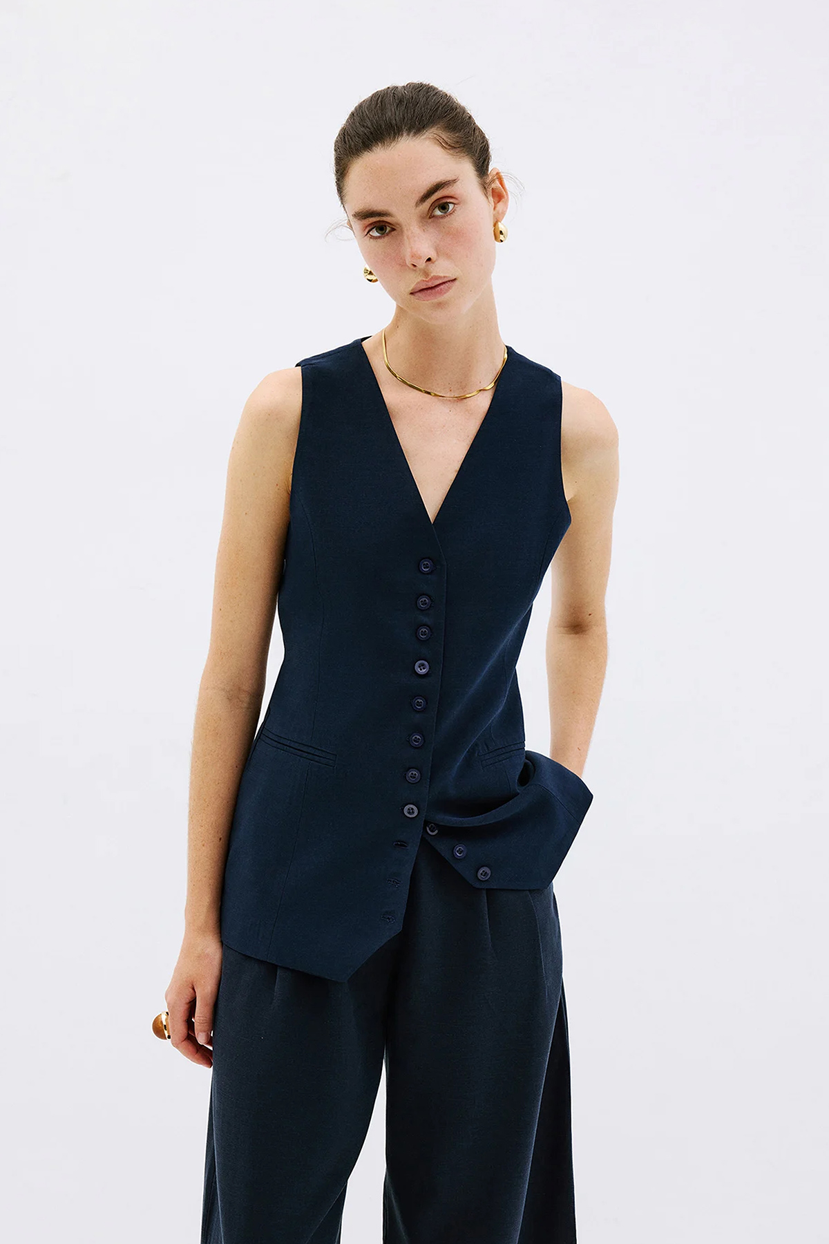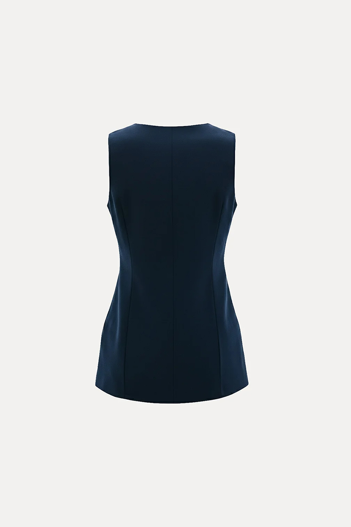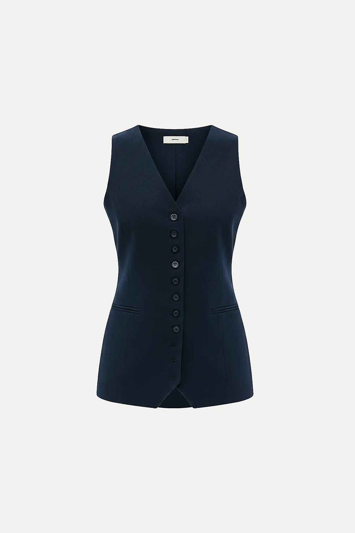 V yaka, kolsuz, önü düğmeli, belden oturtmalı, tam kalıp yelek bluz.