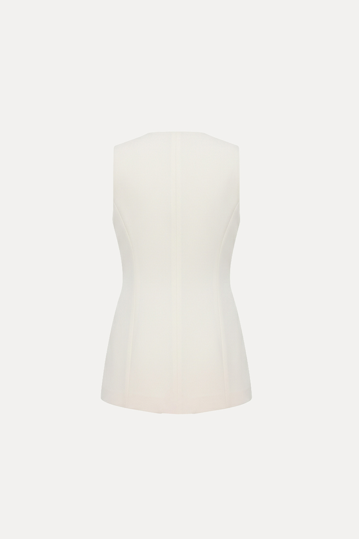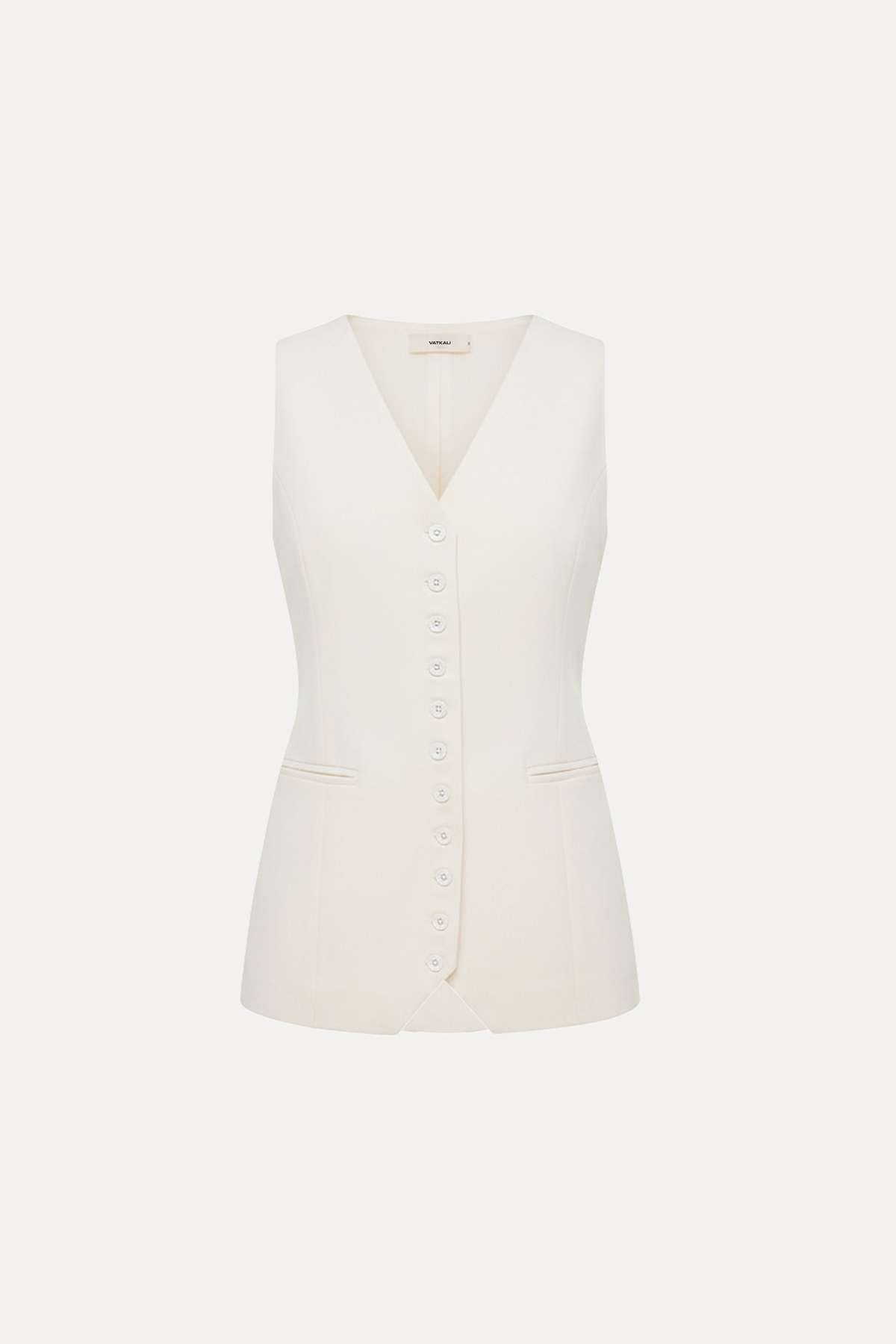 V yaka, kolsuz, önü düğmeli, belden oturtmalı, tam kalıp yelek bluz.