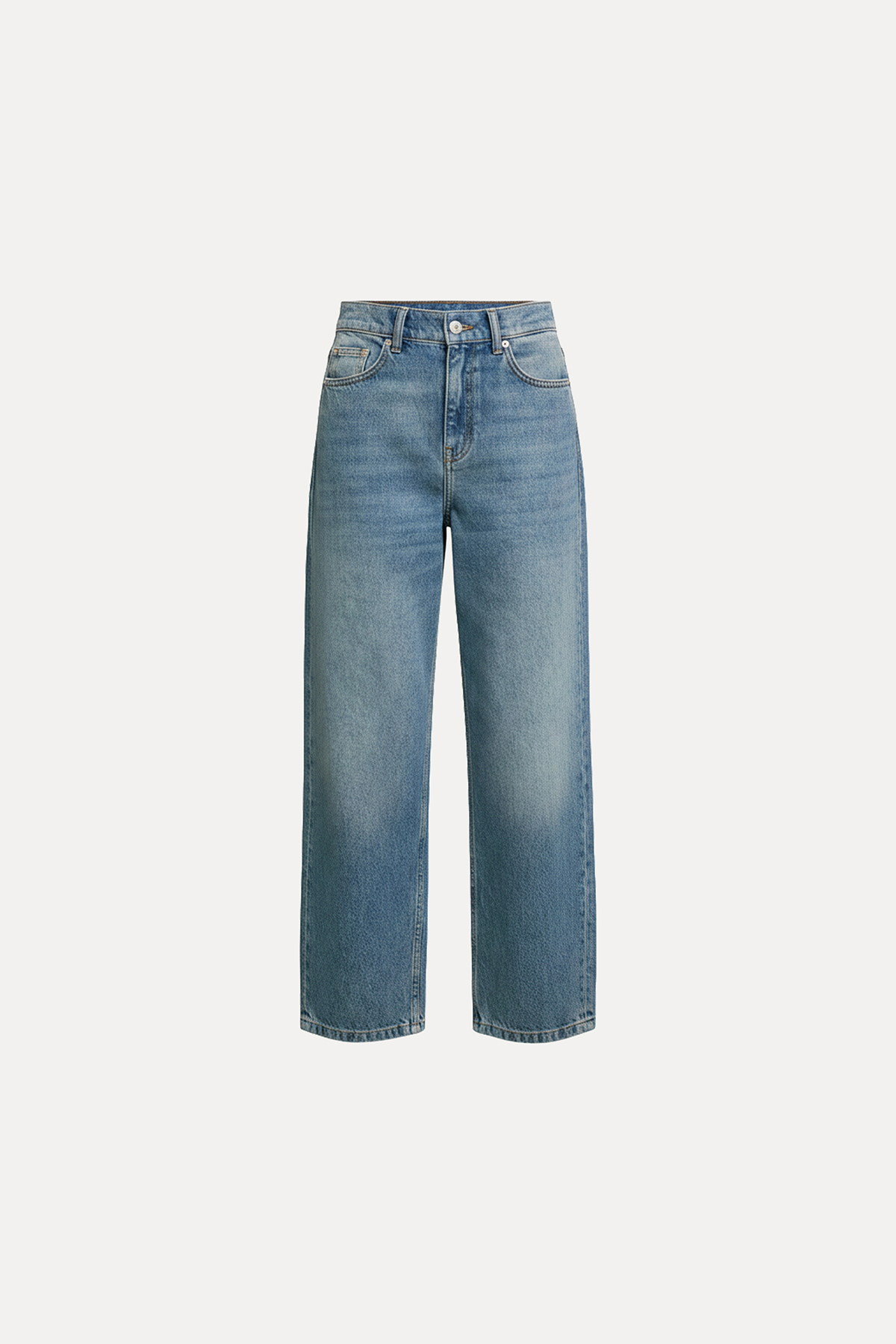 Yüksek bel, tapered, tam kalıp, düğmeli ve fermuarlı, 3 ön 2 arka cepli jean.