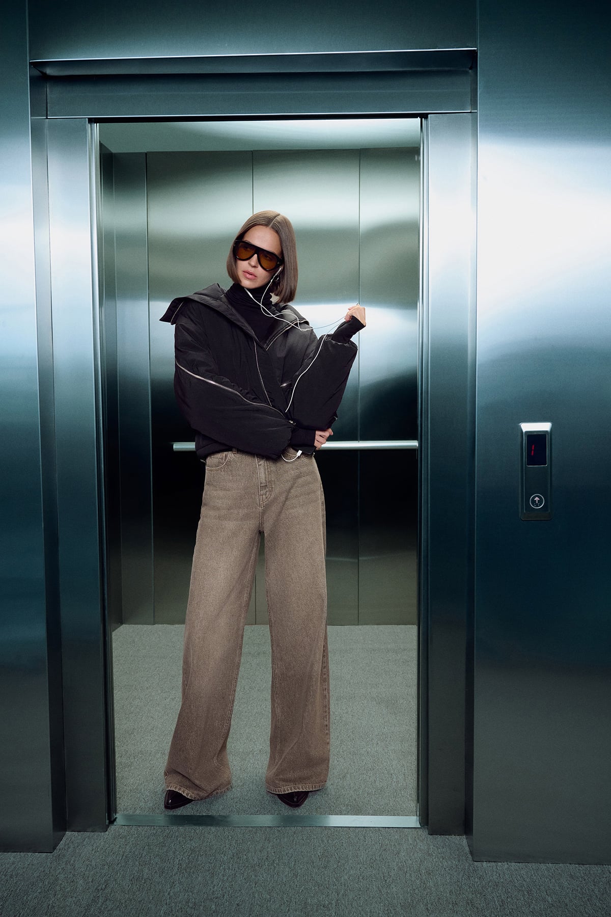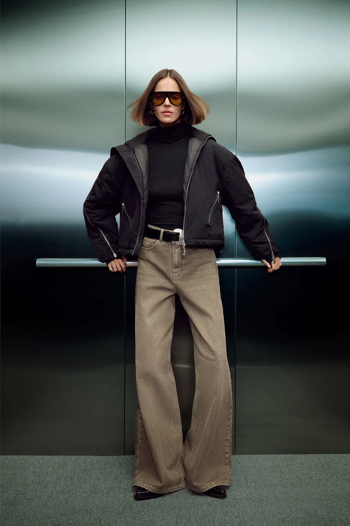 Yüksek bel, düğmeli ve fermuarlı, bol paça, tam kalıp, wide leg jean.