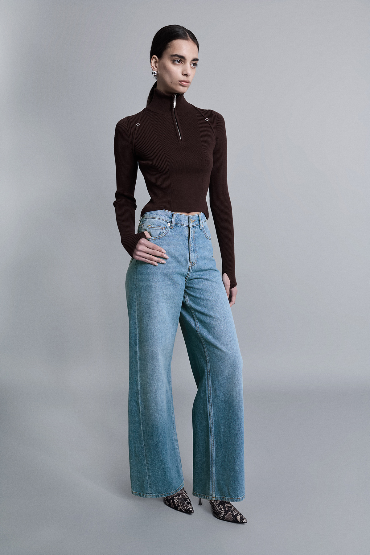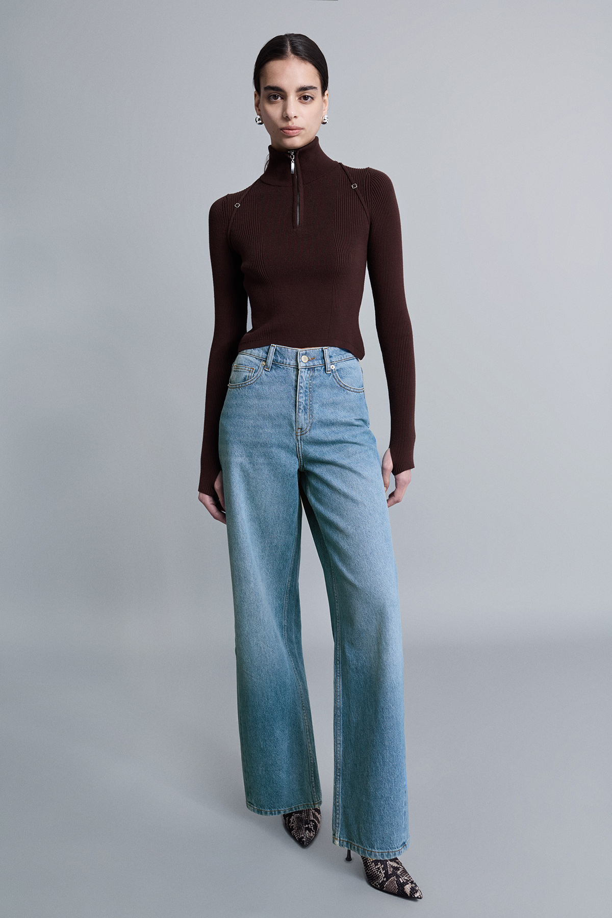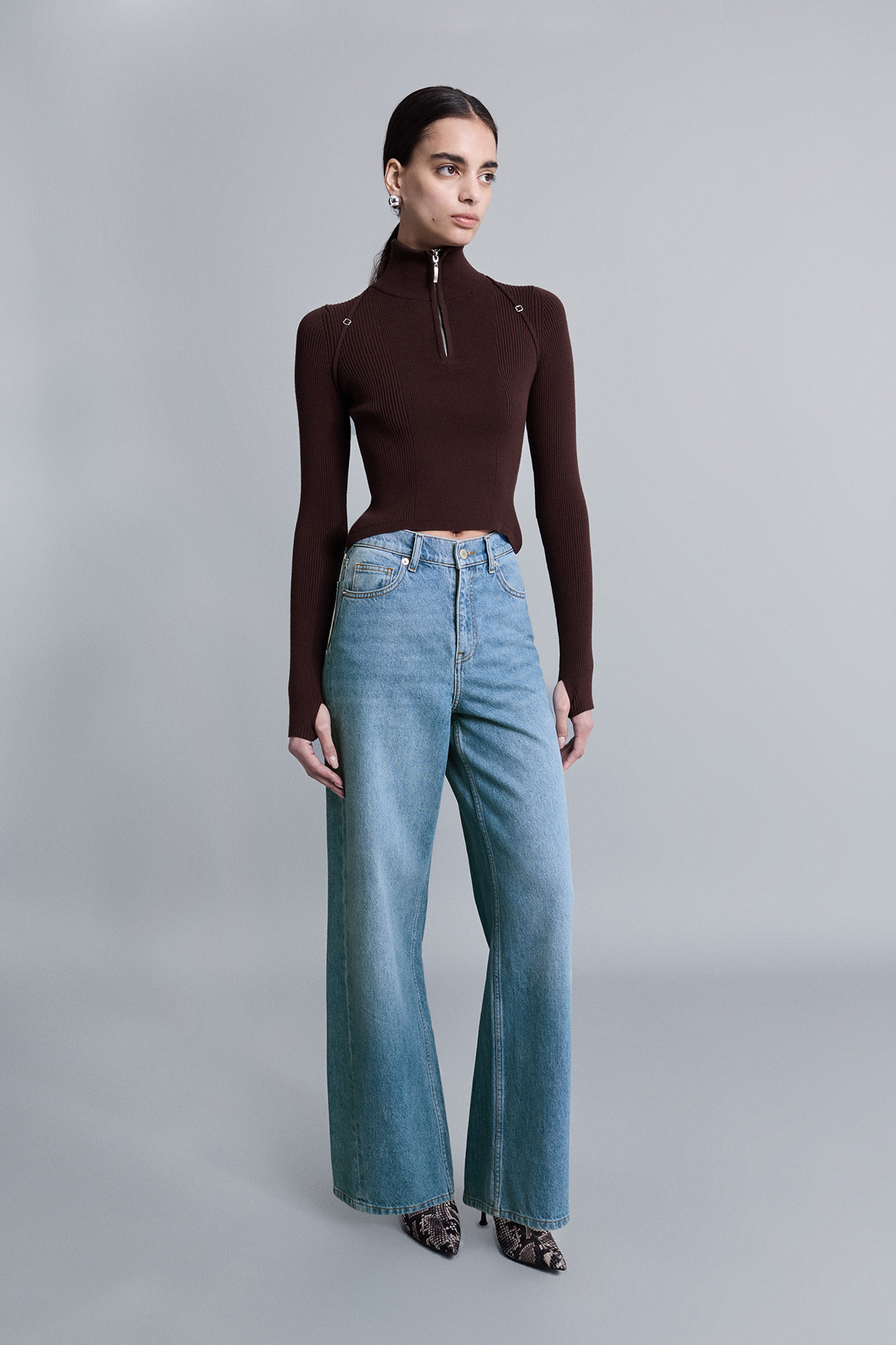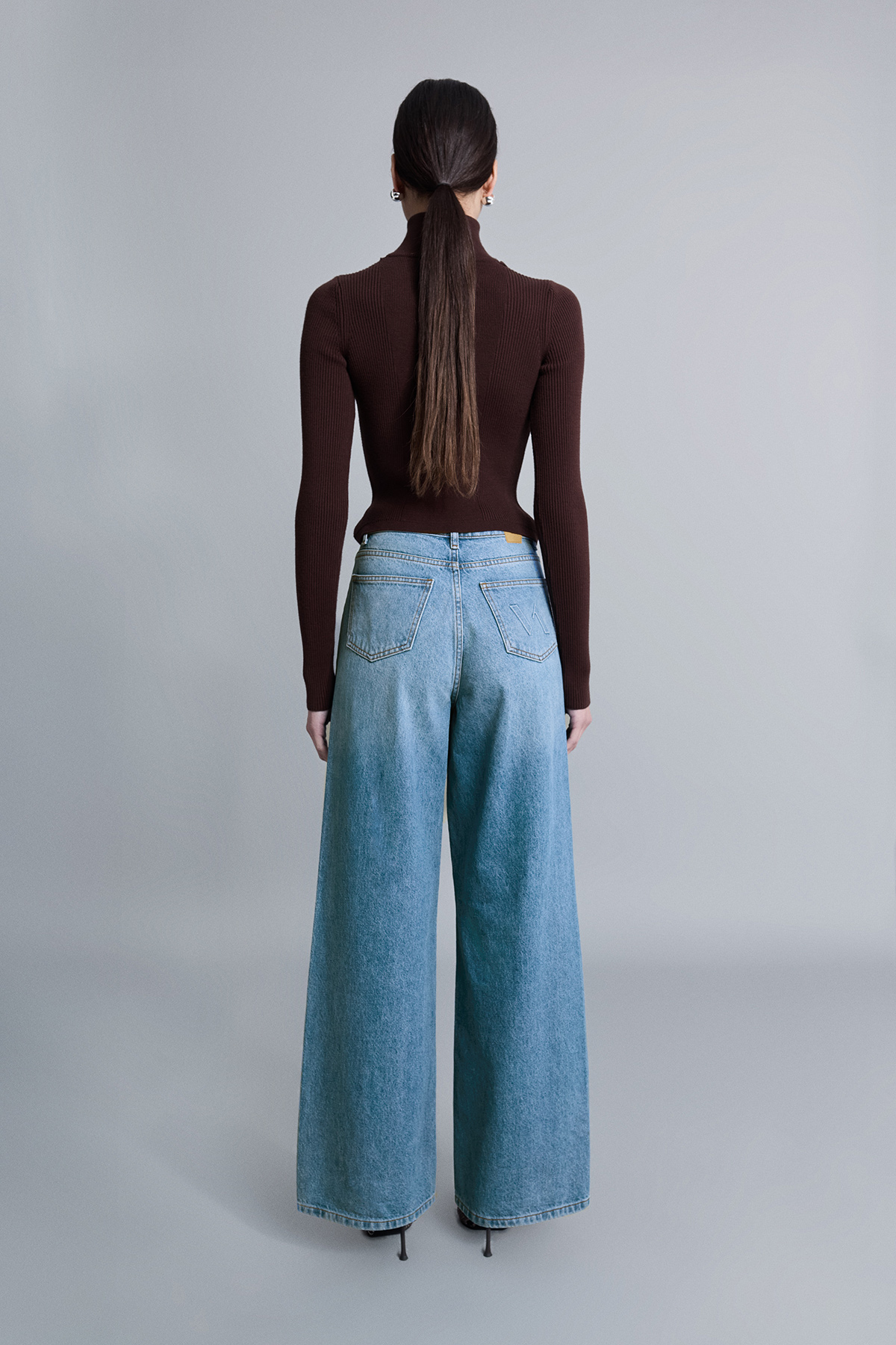 Yüksek bel, bol paça, tam kalıp, düğmeli ve fermuarlı, 3 ön 2 arka cepli jean.