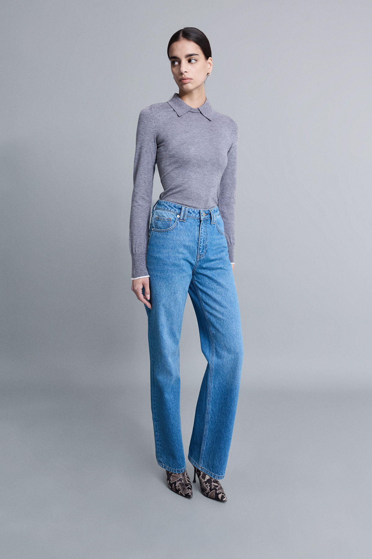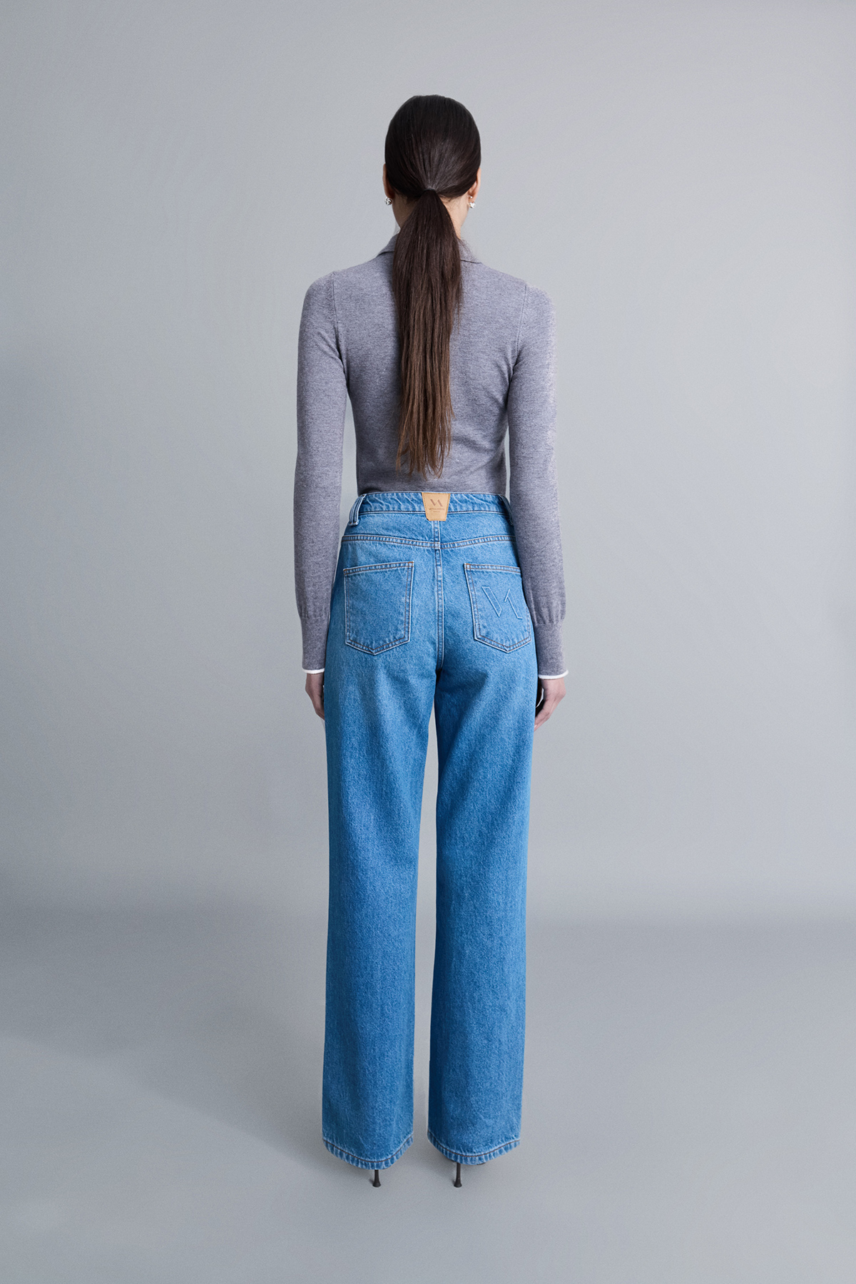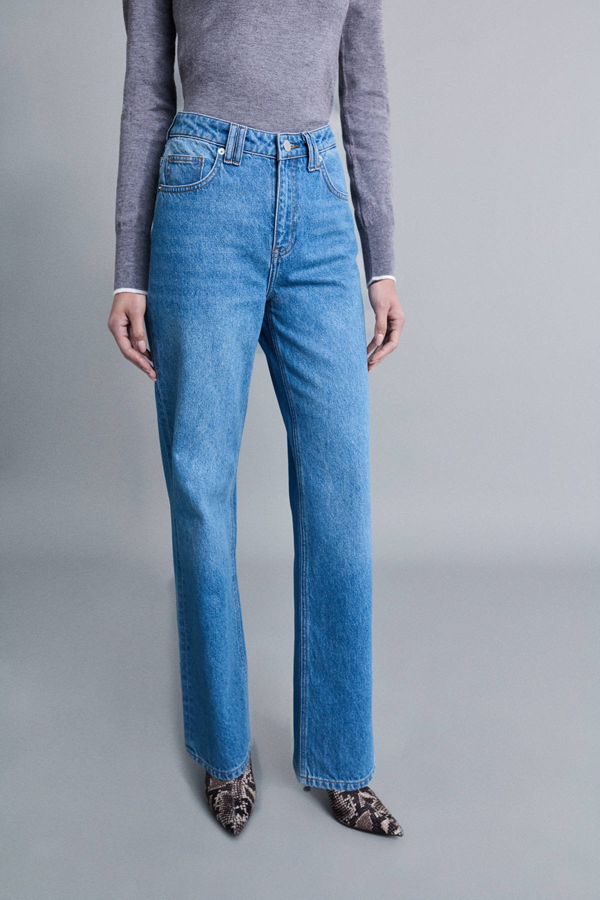 Yüksek bel, düz kesim, çift köprülü, tam kalıp, düğmeli ve fermuarlı, 3 ön 2 arka cepli jean.