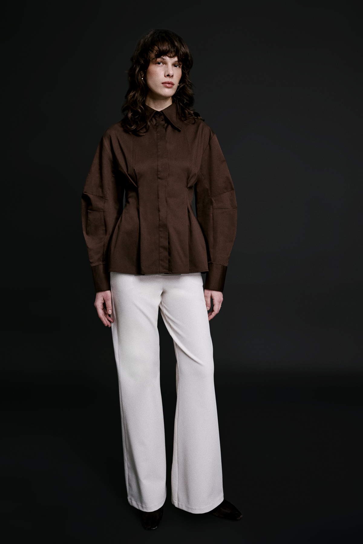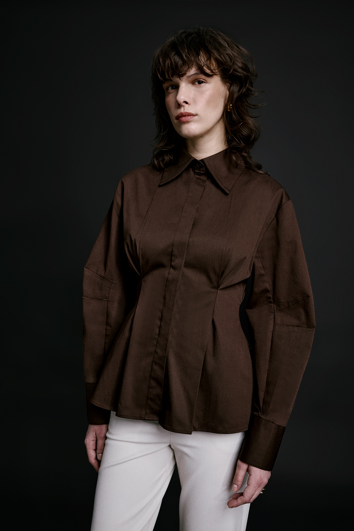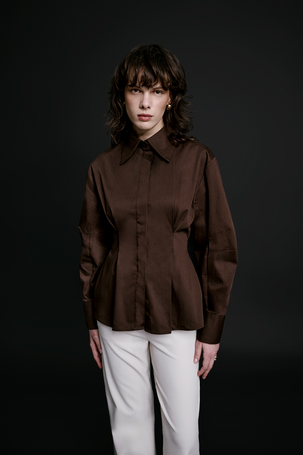 Belden oturtmalı, vücut formunu dengeleyen kalıp, ön dikiş detaylarıyla şekillendirilmiş silüet, klasik yaka, geniş manşetli, gizli pat düğme kapamalı gömlek.