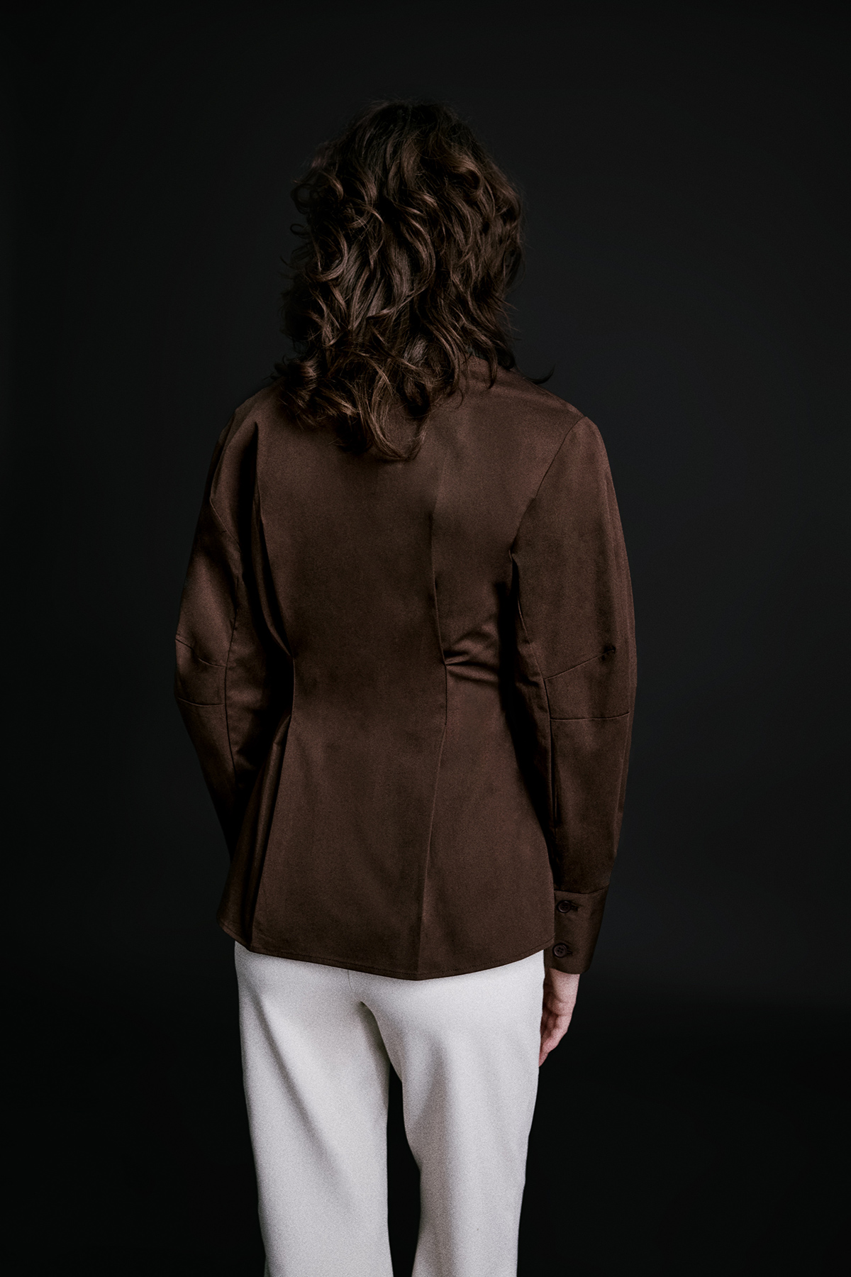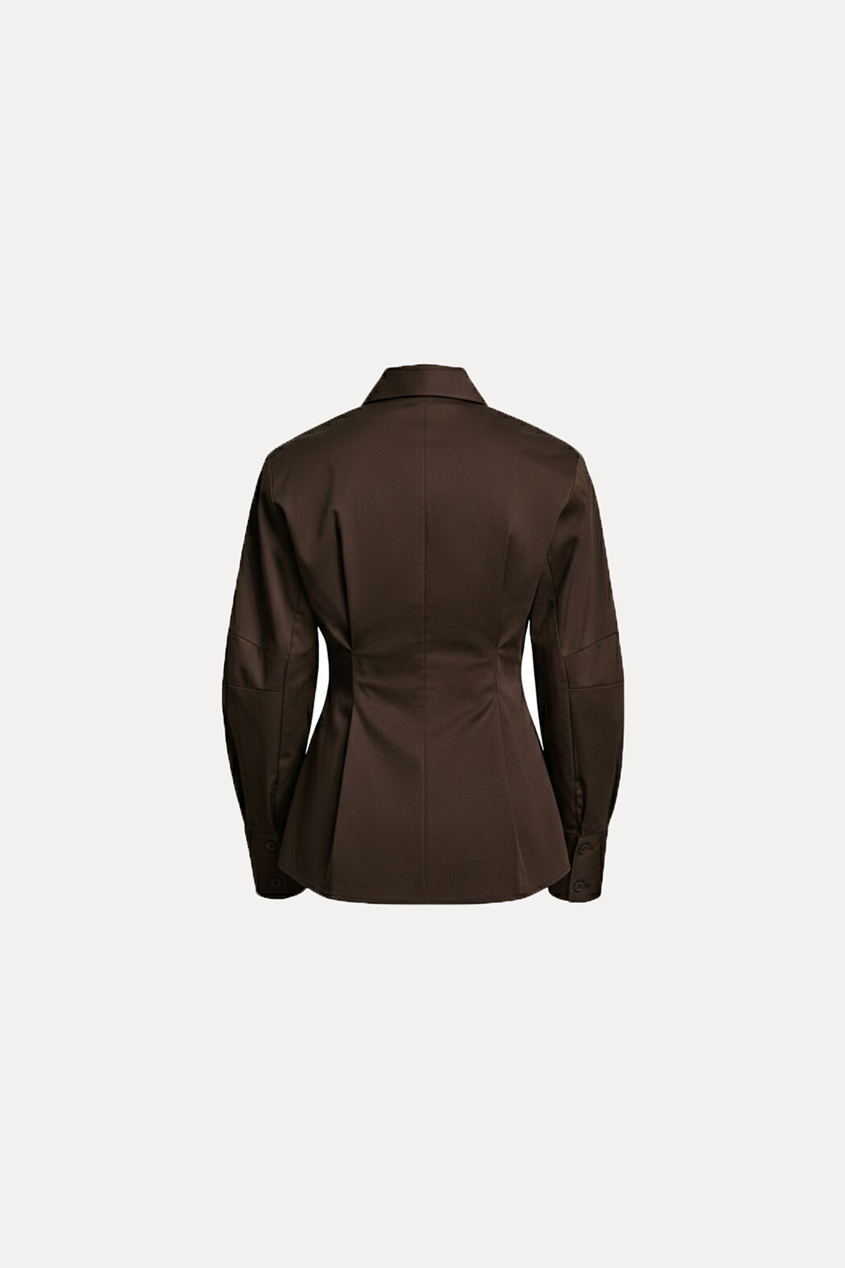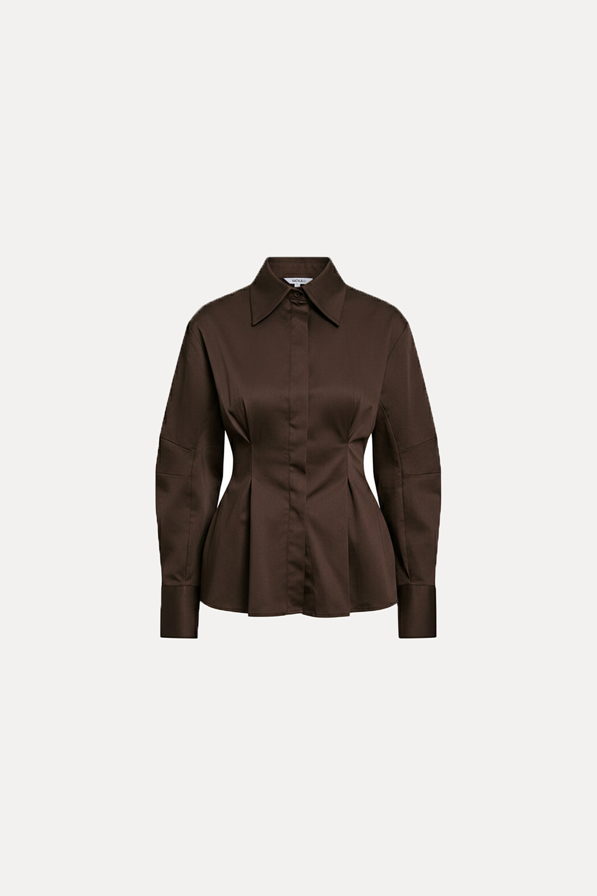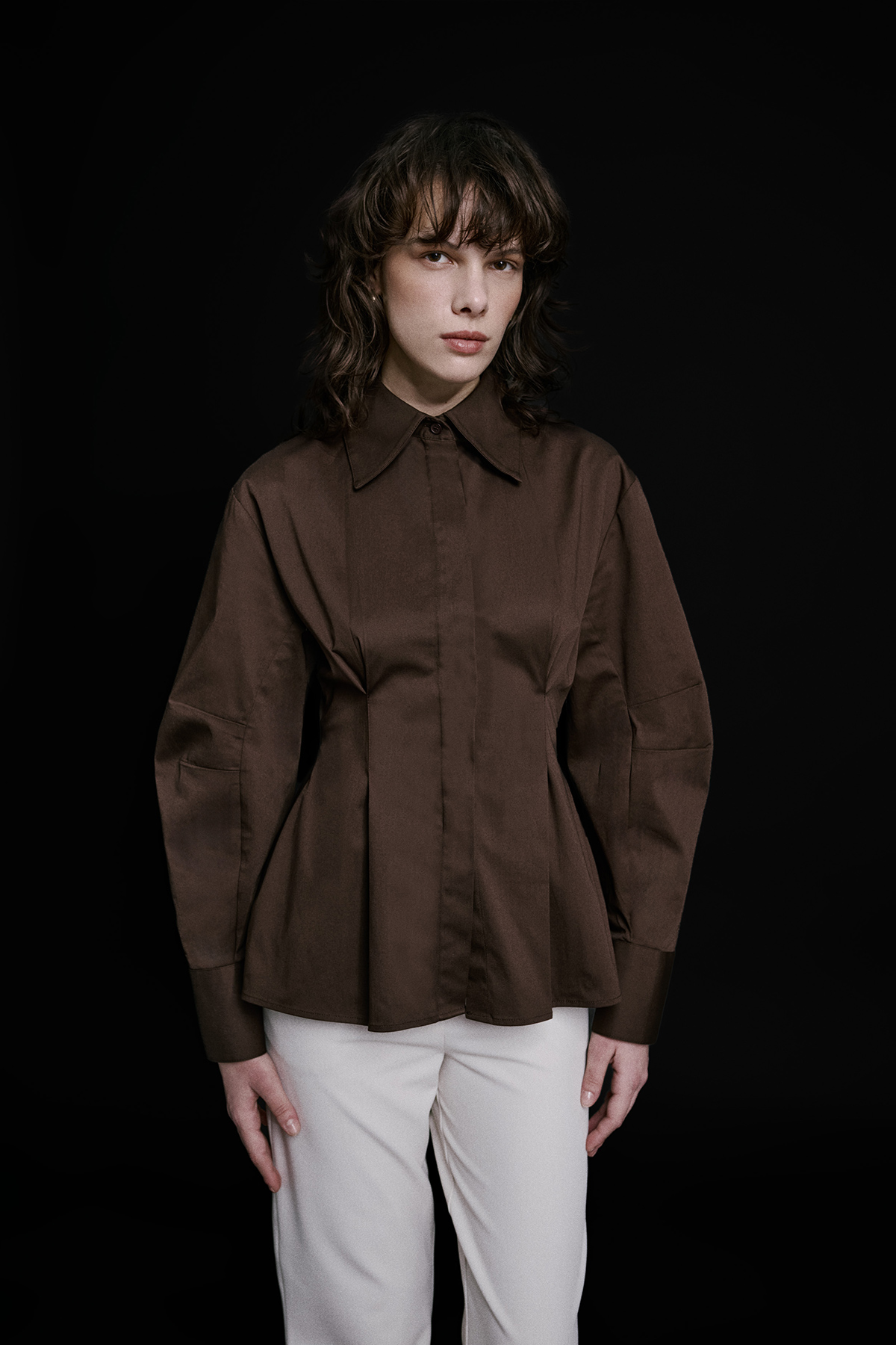 Belden oturtmalı, vücut formunu dengeleyen kalıp, ön dikiş detaylarıyla şekillendirilmiş silüet, klasik yaka, geniş manşetli, gizli pat düğme kapamalı gömlek.
