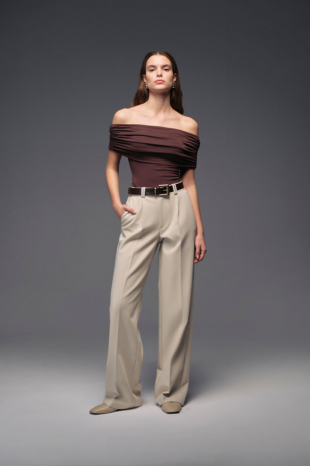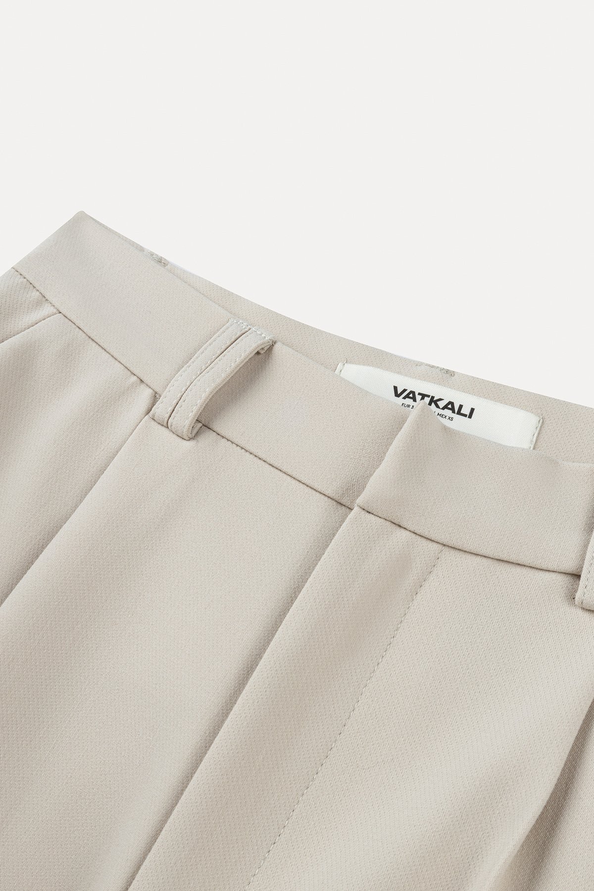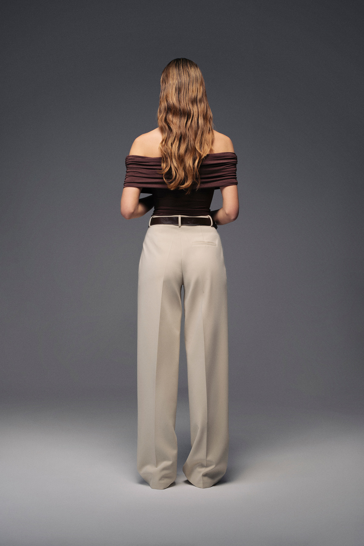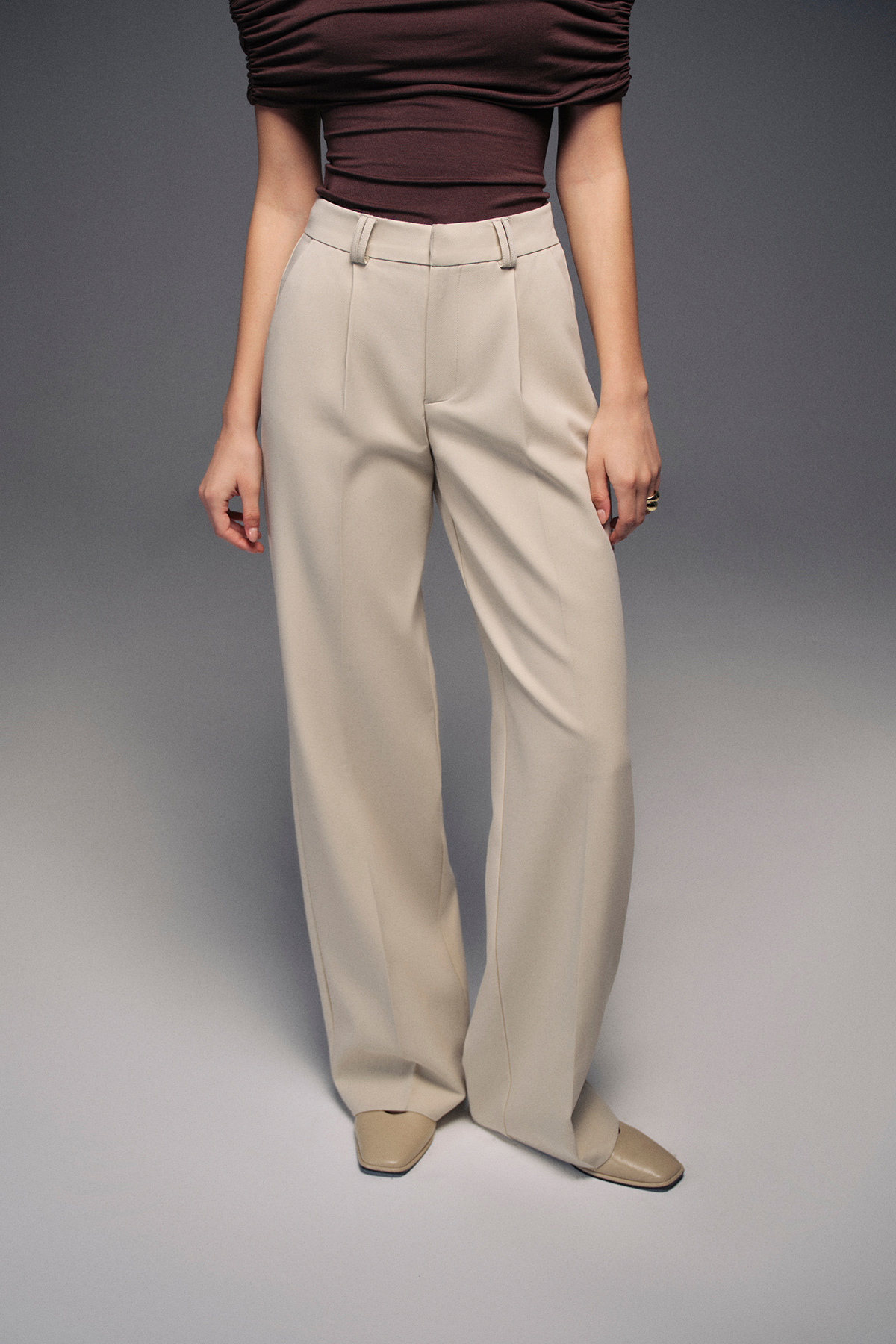 Yüksek bel, pensli, çift köprü detaylı, yanlardan iki cepli, arka kısmı aksesuar cep detaylı, klips, fermuar ve düğme kapamalı, bol paça, tam kalıp pantolon.