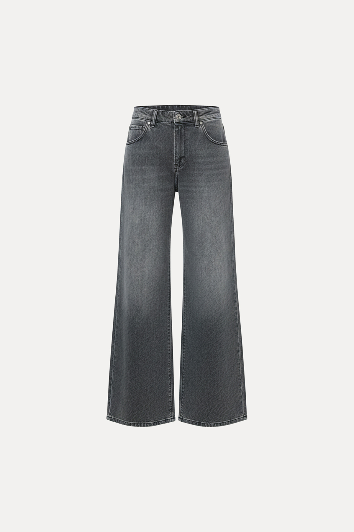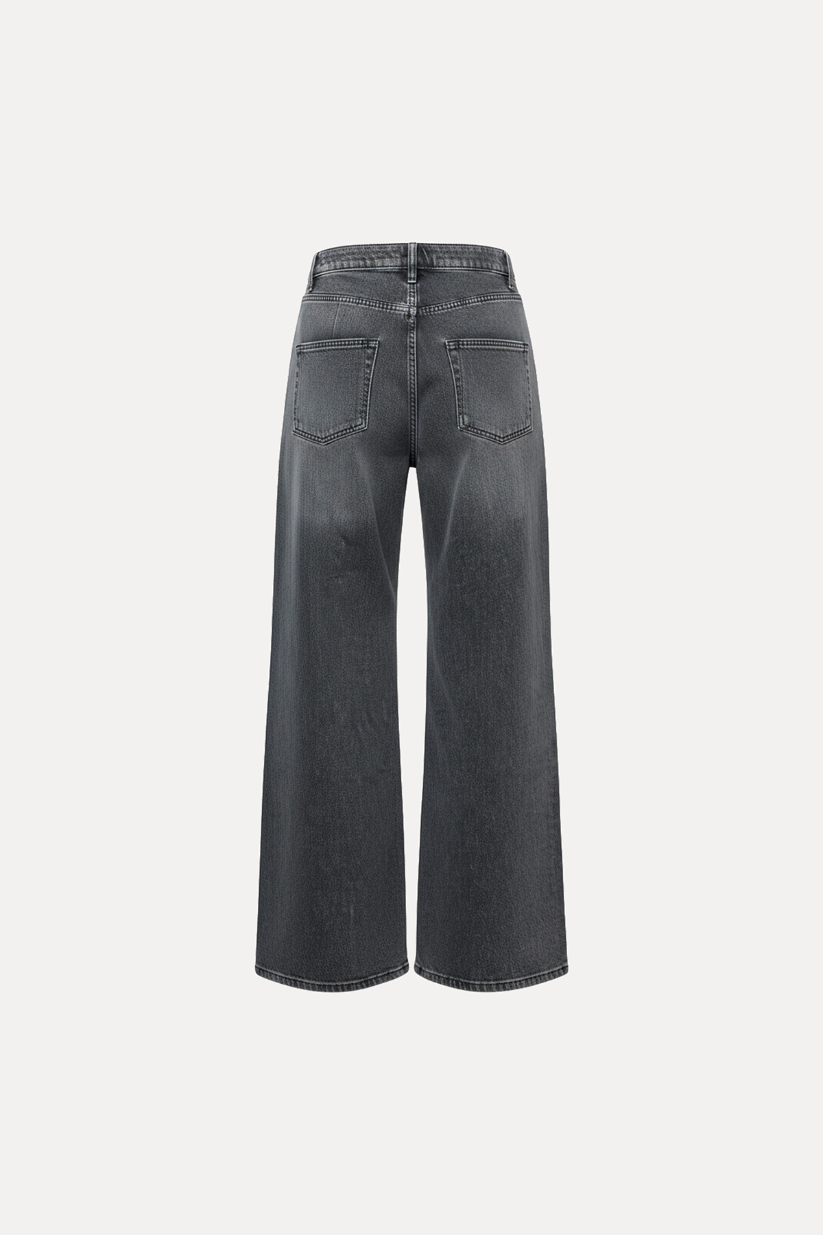 Önü fermuarlı ve metal düğmeli, beş cepli, ekstra uzun bacaklı, geniş paça, yüksek bel jean.