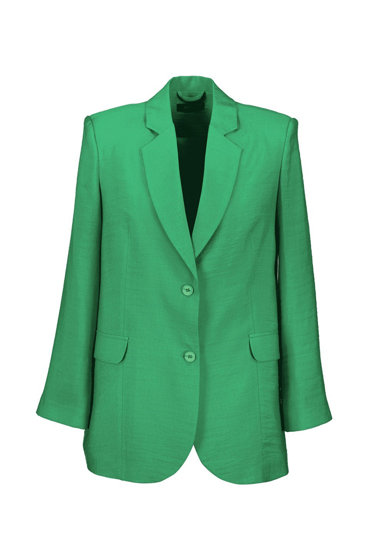 Oversize rahat kalıp, önü düğmeli, sahte cepli, vatkalı, içi astarlı kruvaze yaka ceket.