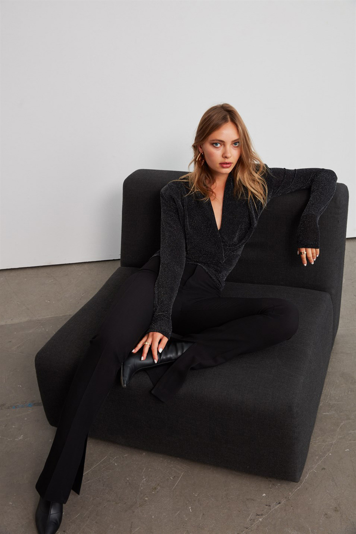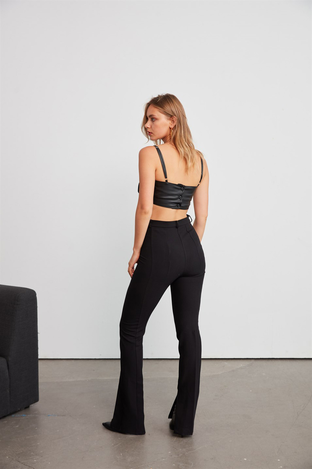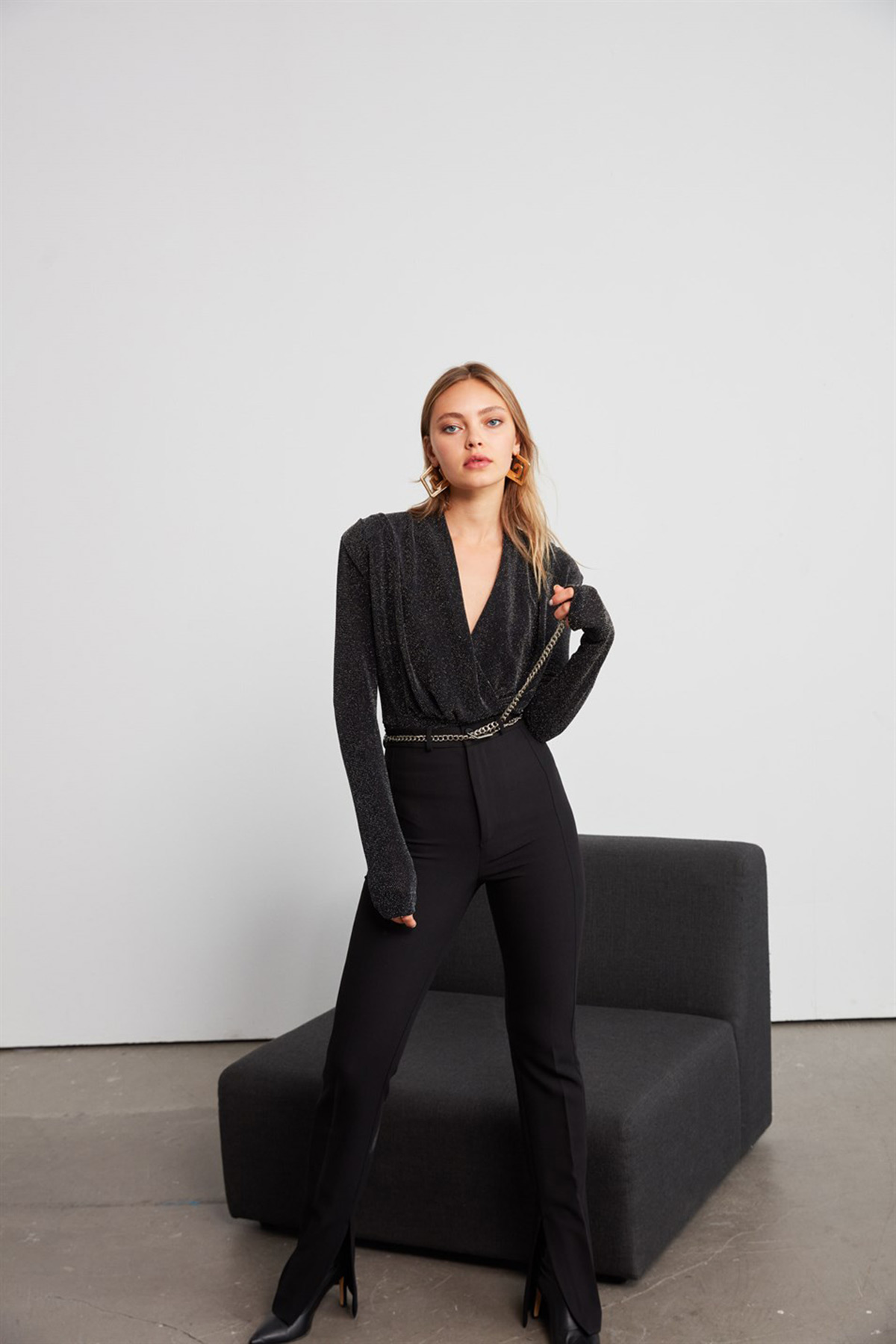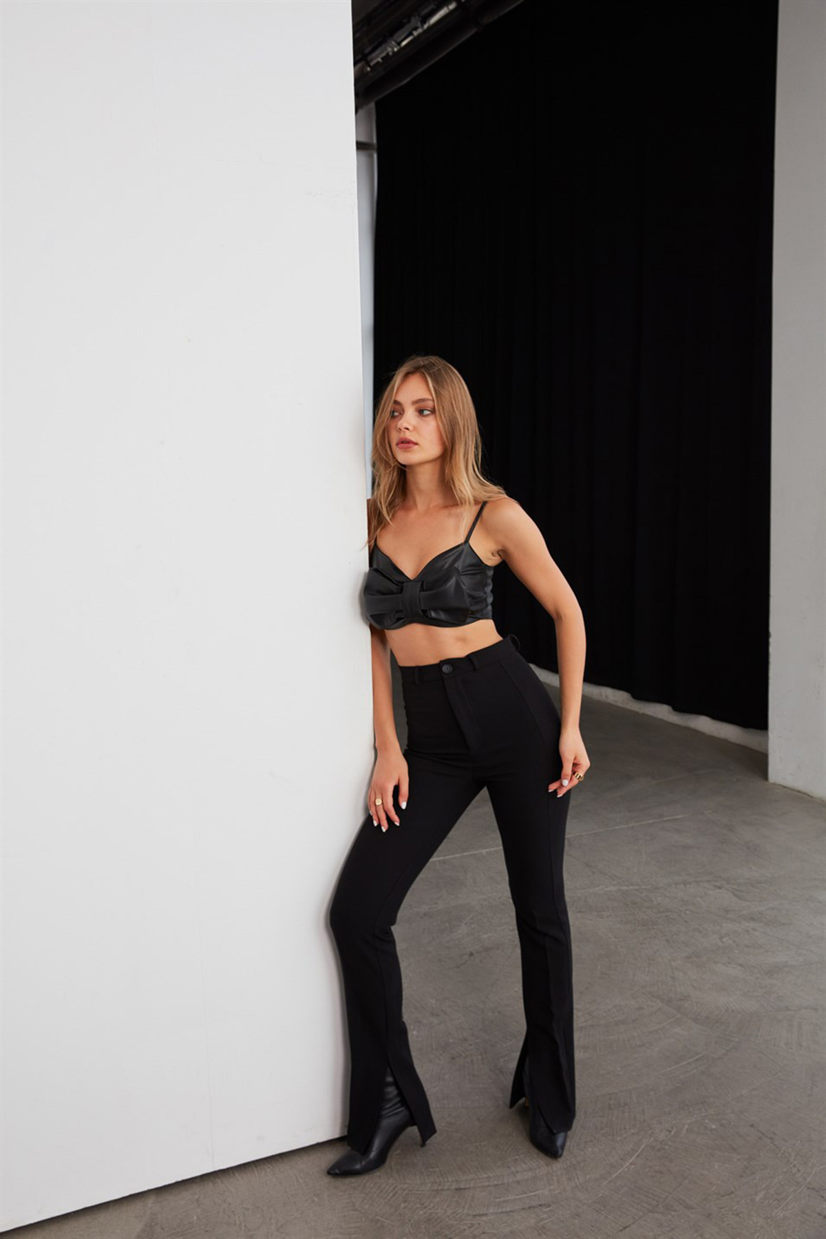 Yüksek bel, düğmeli ve fermuarlı, önü tek, arkası çift görünür dikiş detaylı, paçası yırtmaçlı kumaş pantolon.