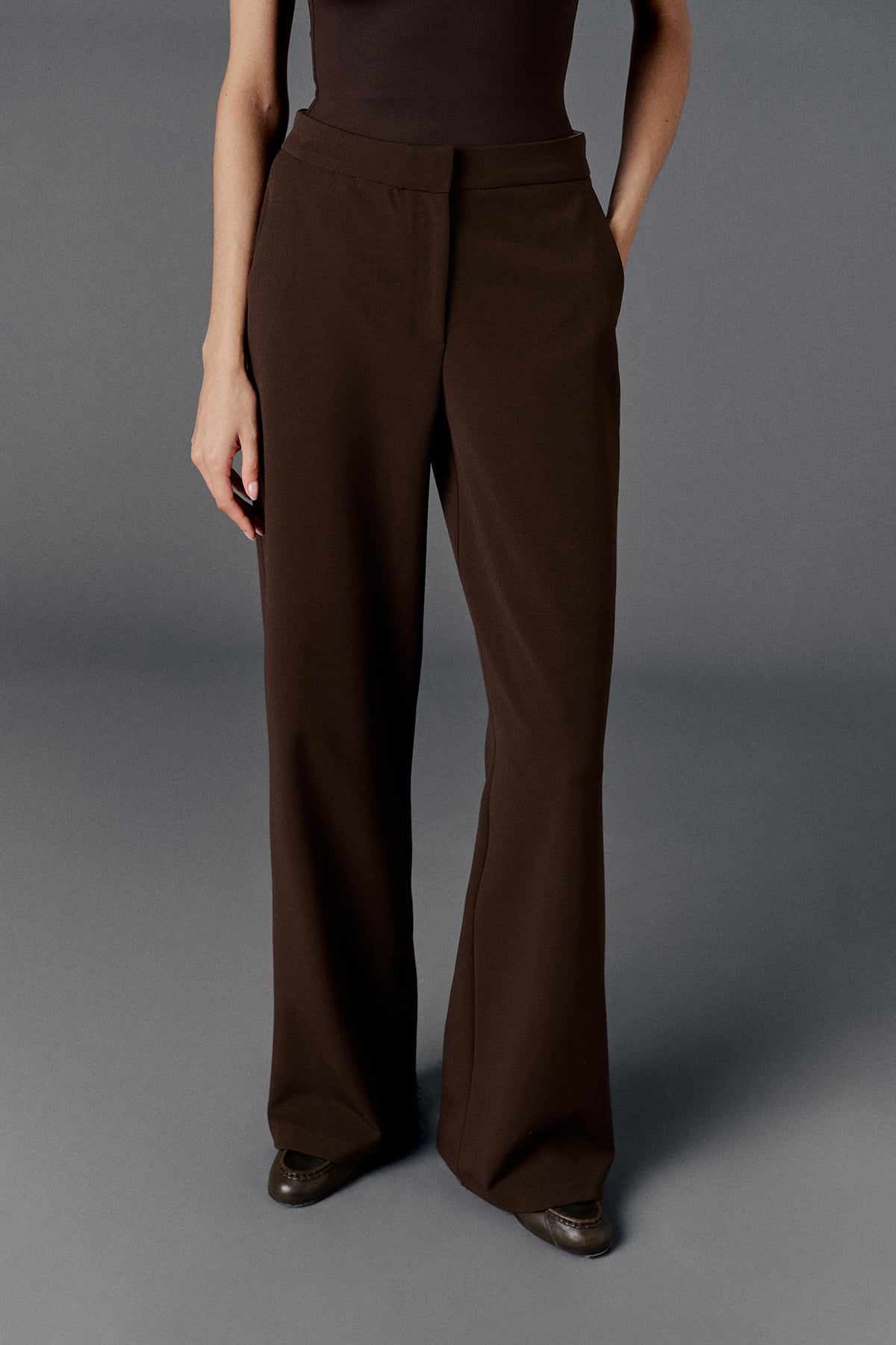 Yüksek bel, düğmeli ve fermuarlı, astarsız, tam kalıp, düz kesim pantolon