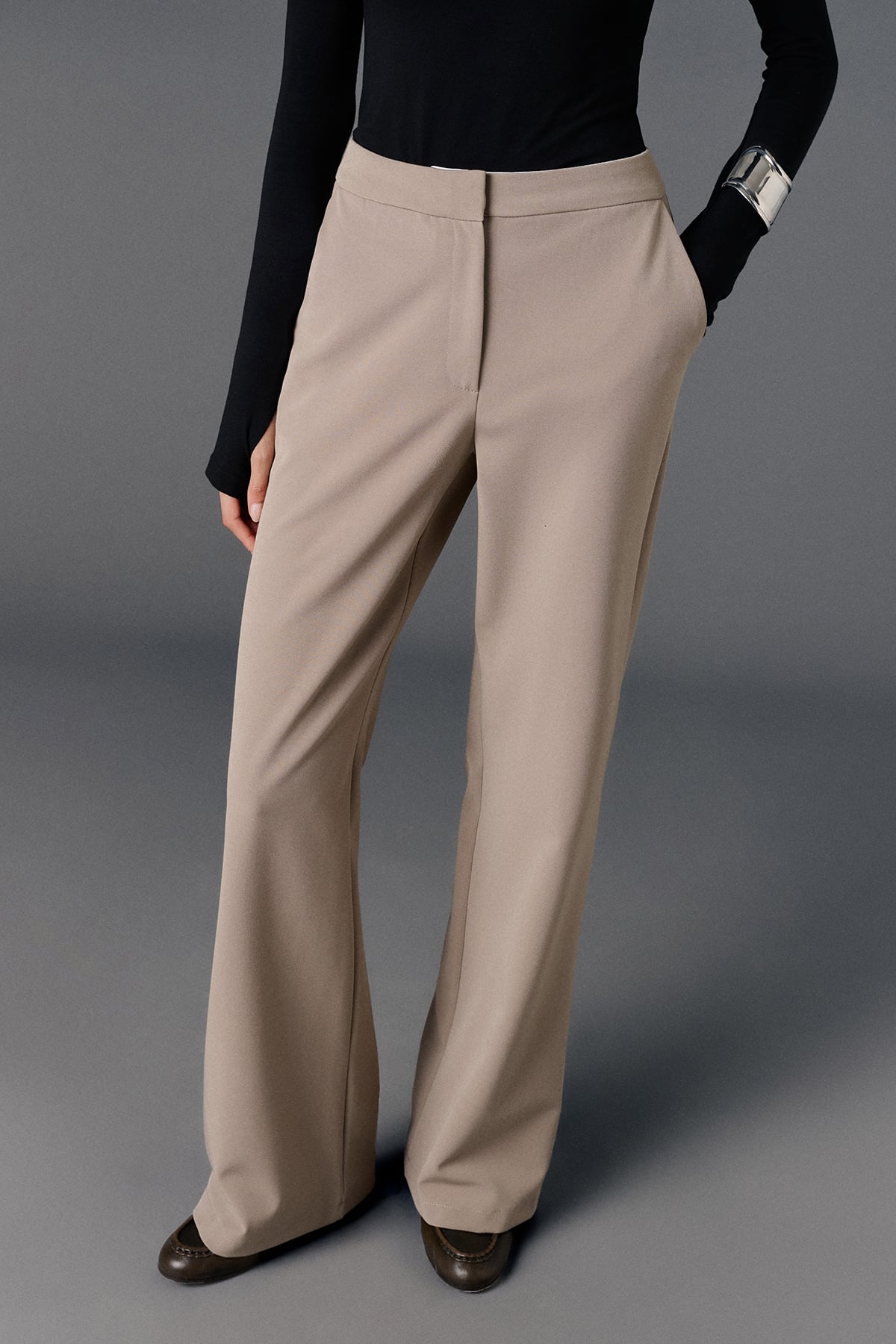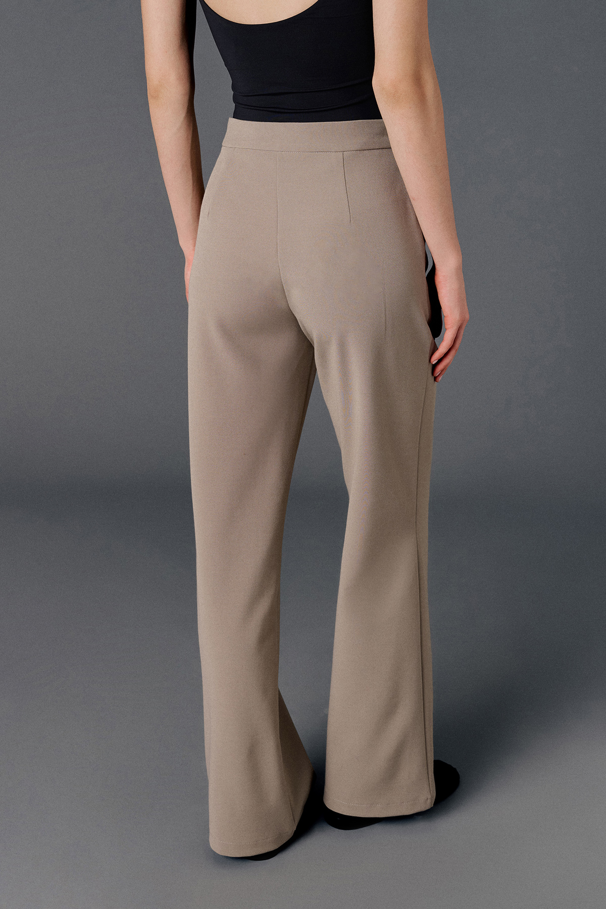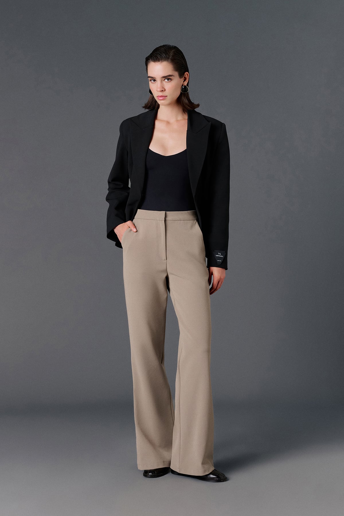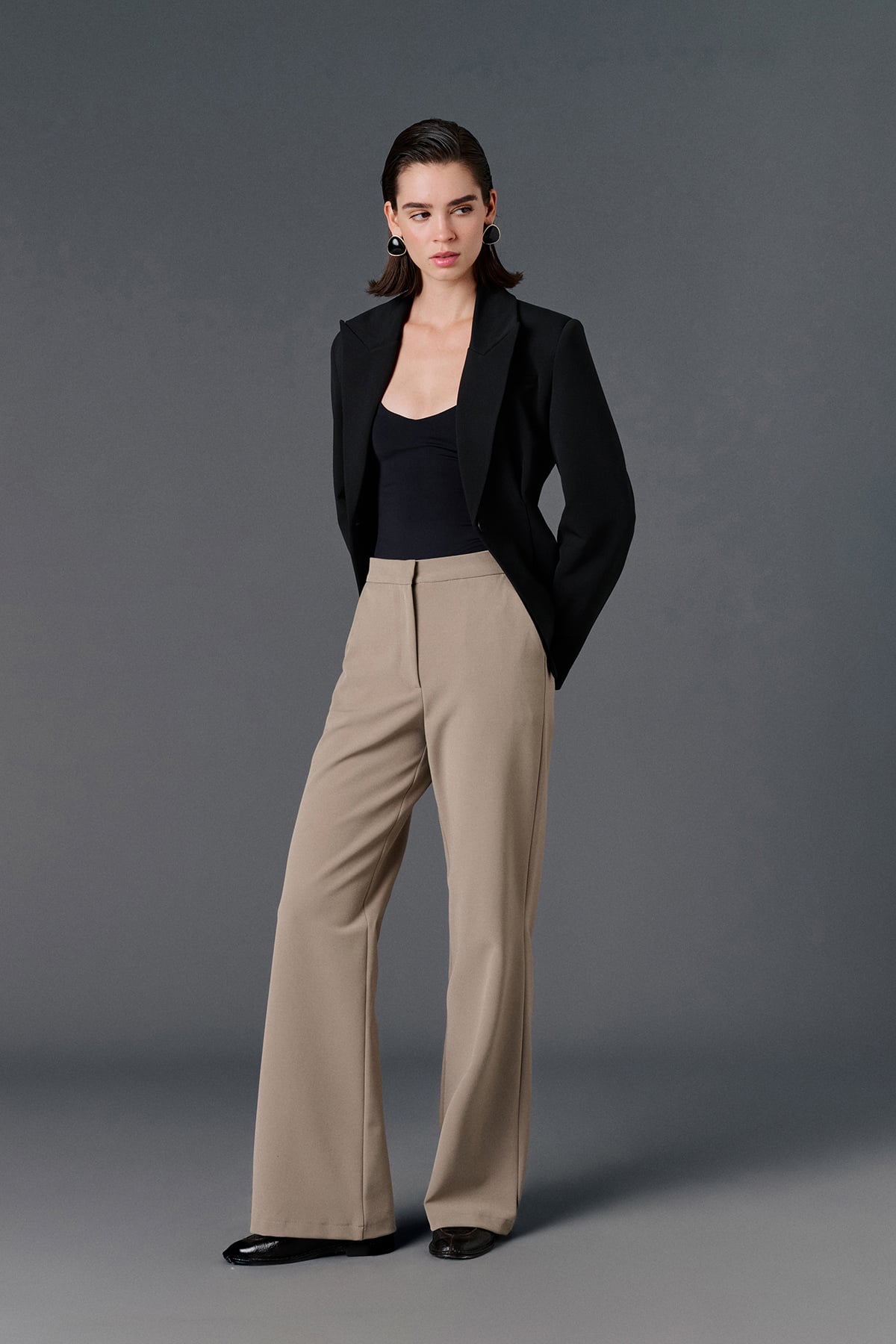 Yüksek bel, düğmeli ve fermuarlı, astarsız, tam kalıp, düz kesim pantolon