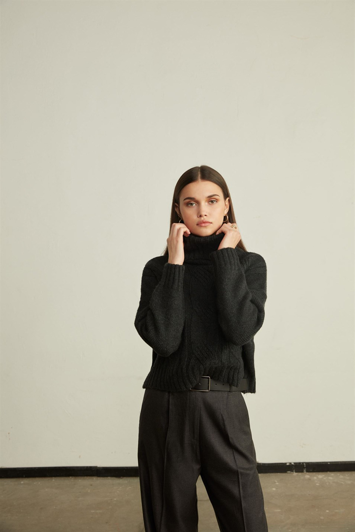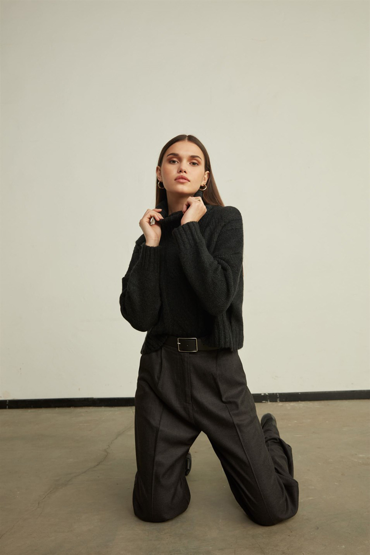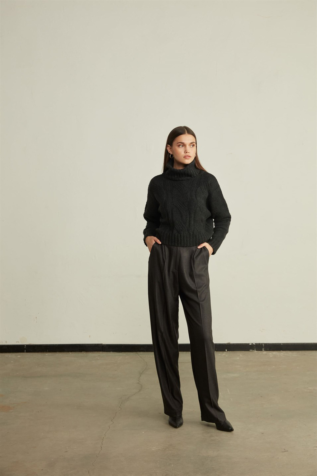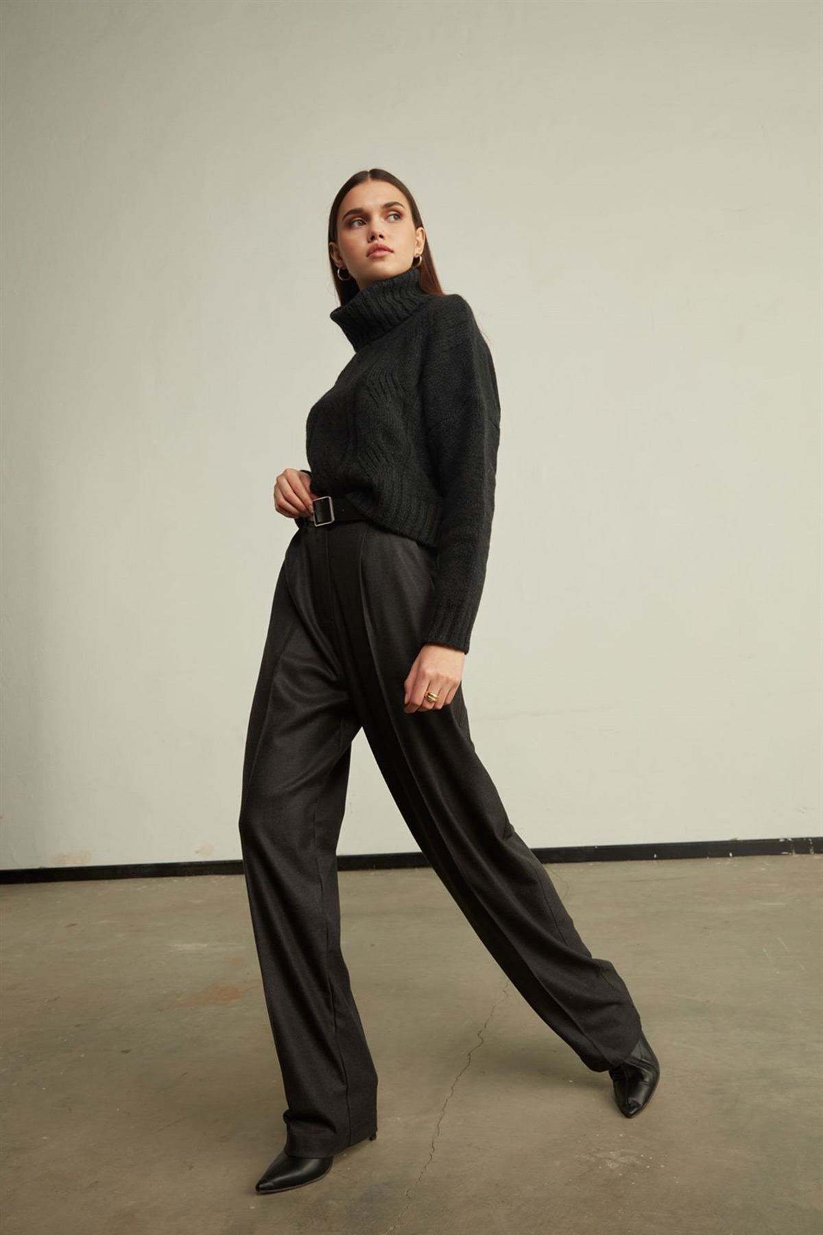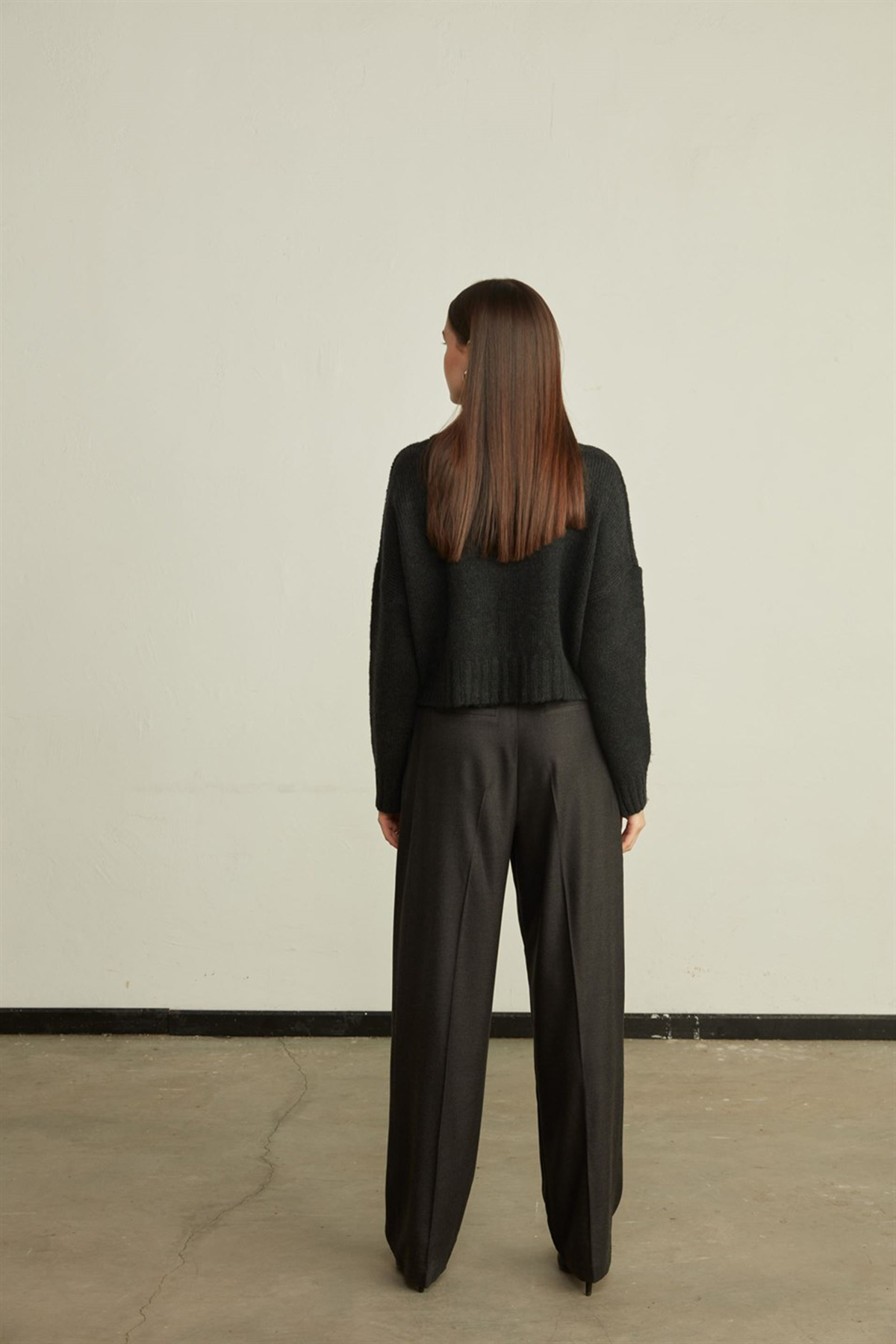 Yüksek bel, 2 ön cepli, arkası sahte cepli, tek pensli ve gizli düğmeli palazzo pantolon.
