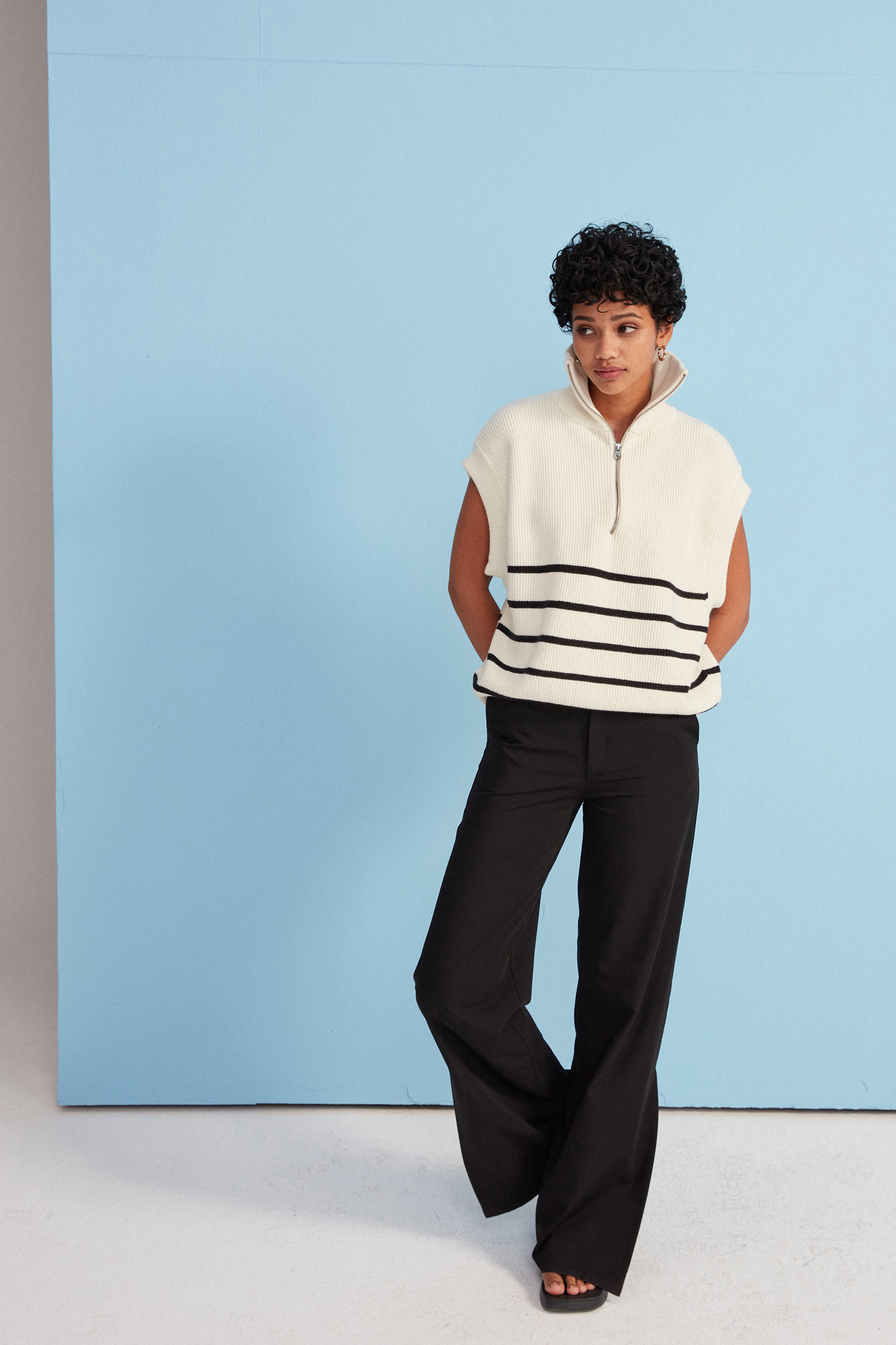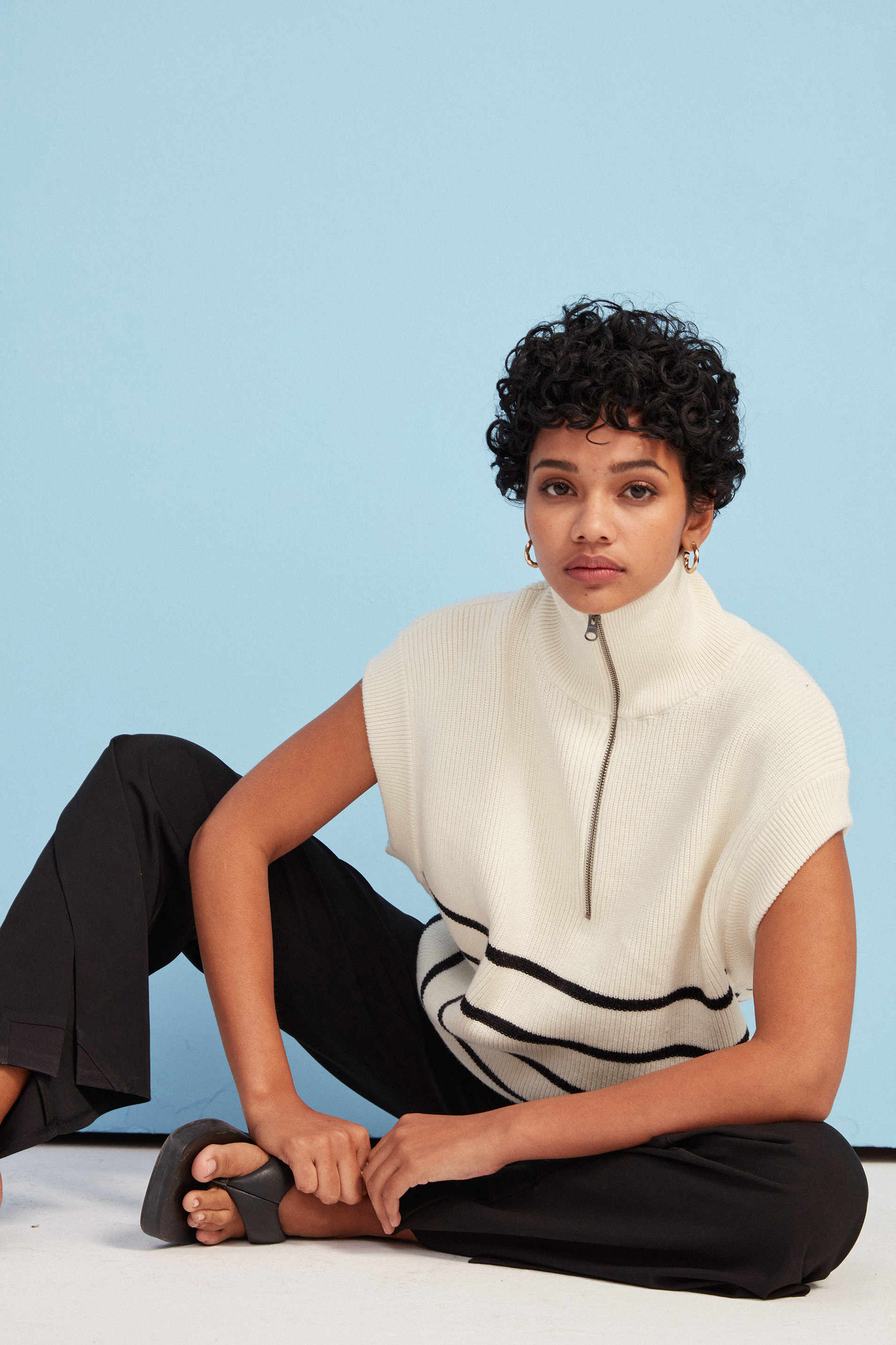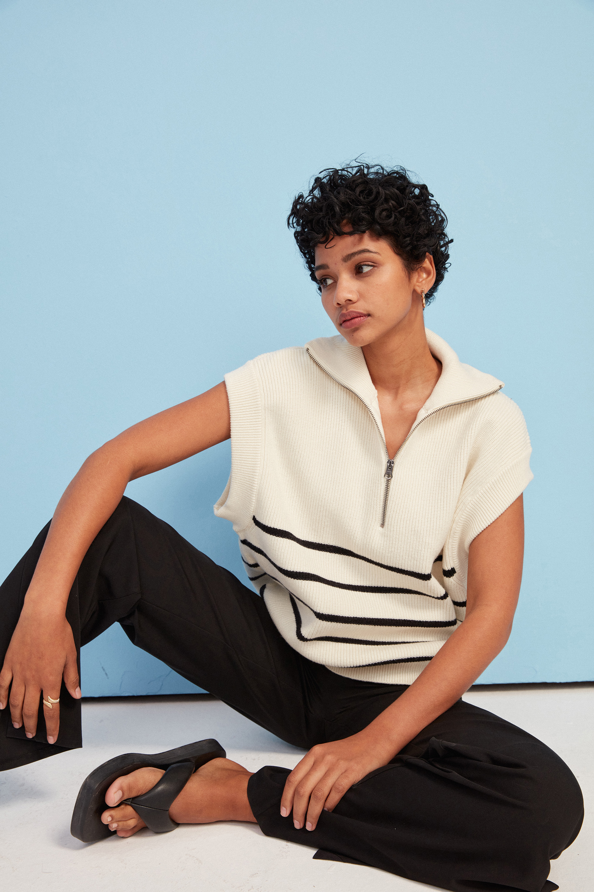 Yarım balıkçı yaka, önden yarım fermuarlı,çizgili kadın triko süveter