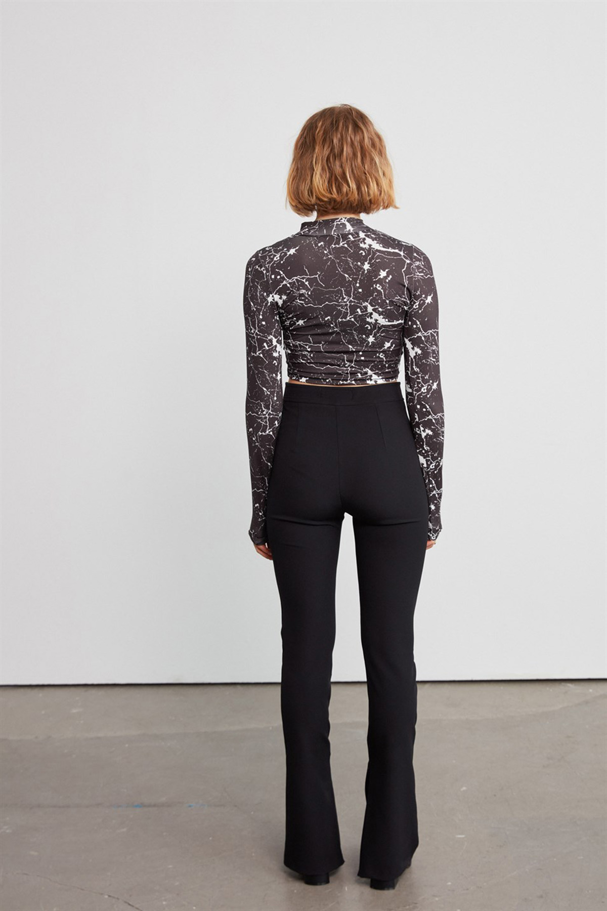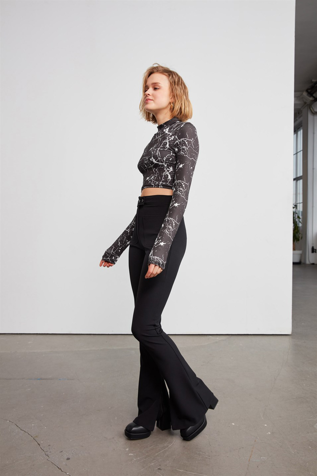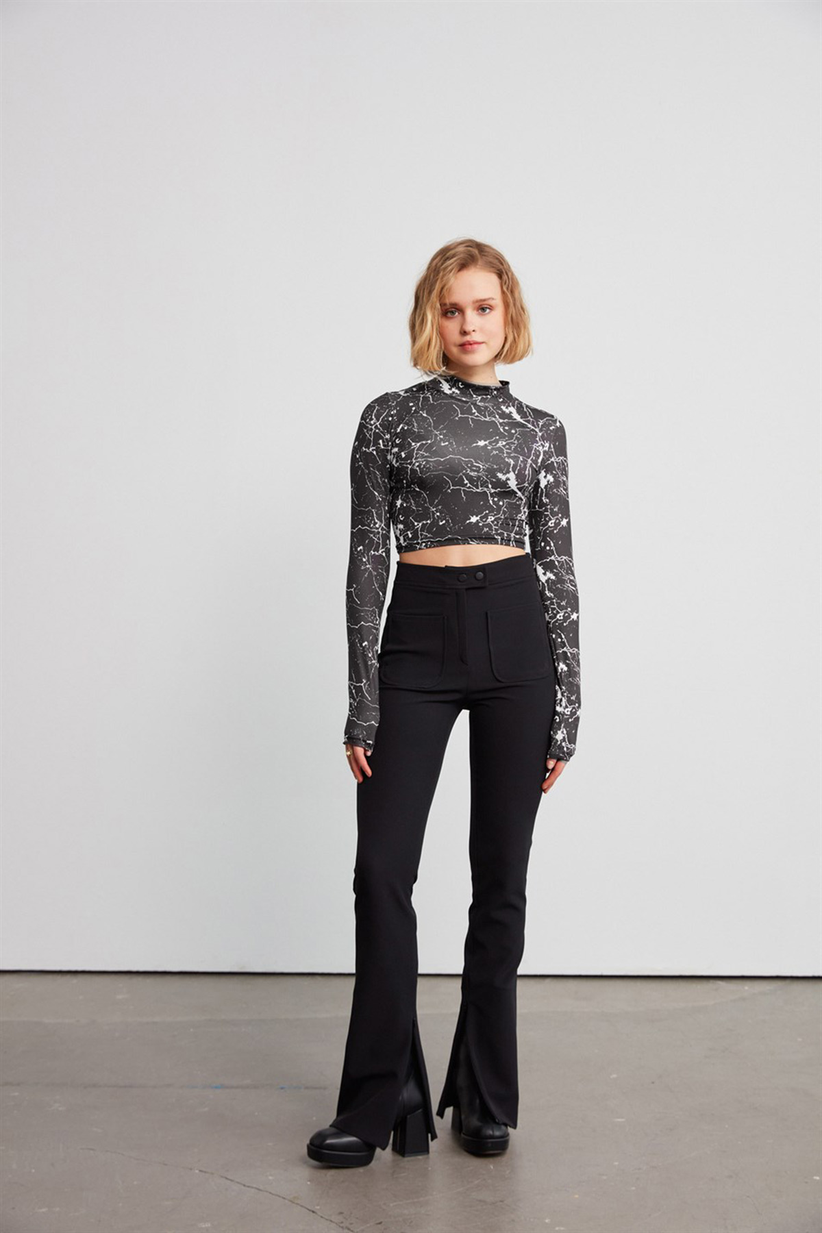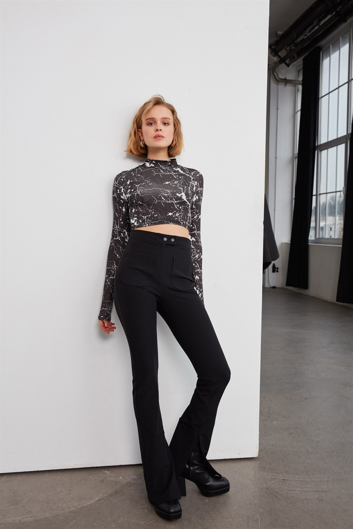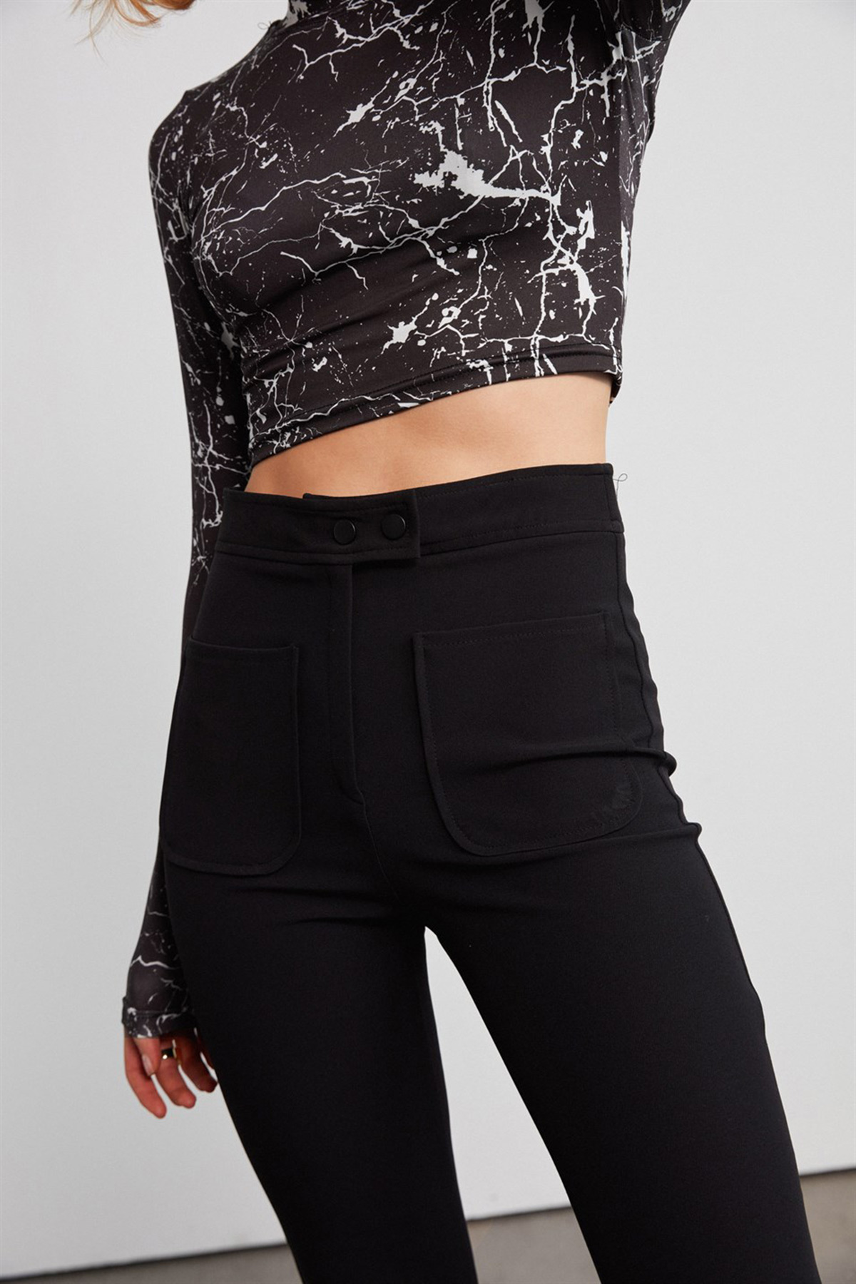 Çift çıtçıt düğme detaylı ve fermuarlı, yanları geniş cepli, fermuar paçalı yüksek bel kadın pantolon.